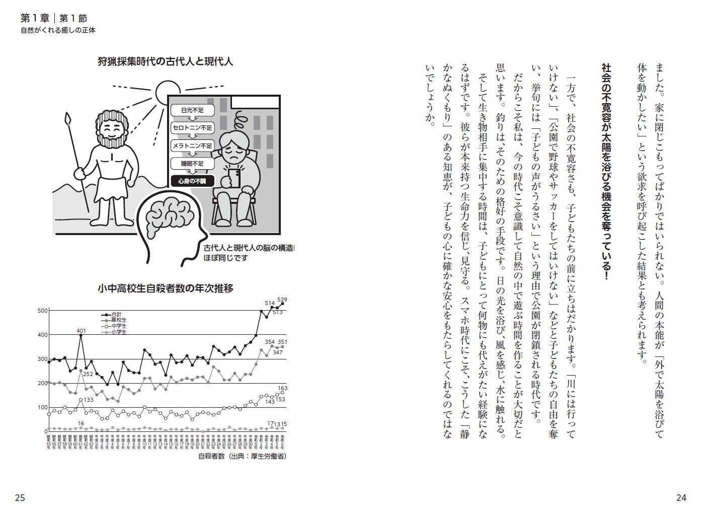 第1章「強い心と自己肯定感が育つ」では、釣りや自然体験が子どもの幸福感や自己肯定感にどう作用するかを考察。釣りが「待つ力」や工夫する力、失敗しても立ち上がる力を育てることを、豊富な事例とともに紹介しています。