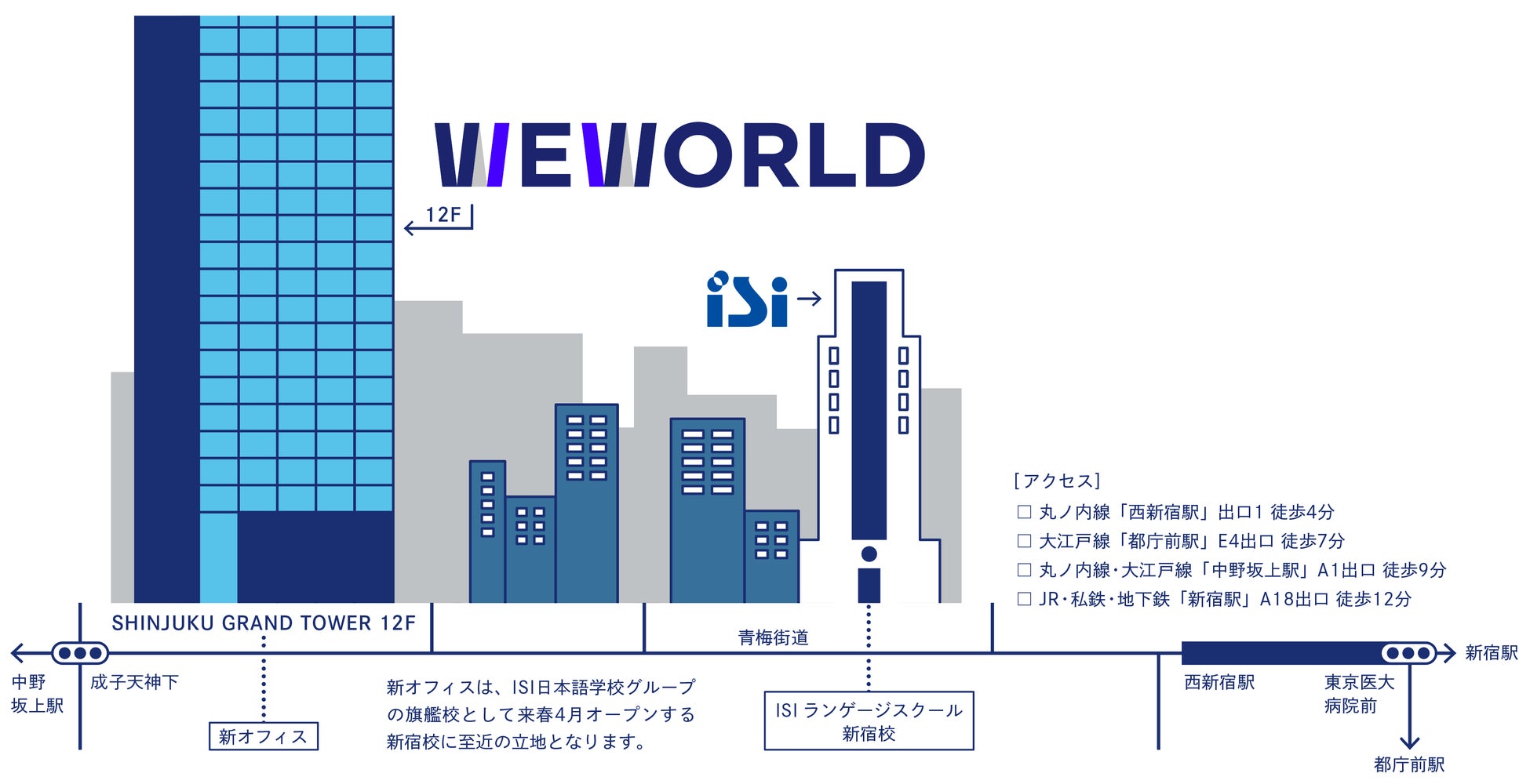 なお、WEWORLDの移転に伴い、株式会社アイ・エス・アイ、株式会社東言グループ、株式会社ニューライン、株式会社リアルエステートの本社、ならびに学校法人ISI学園の法人本部も新オフィスに移転します。
