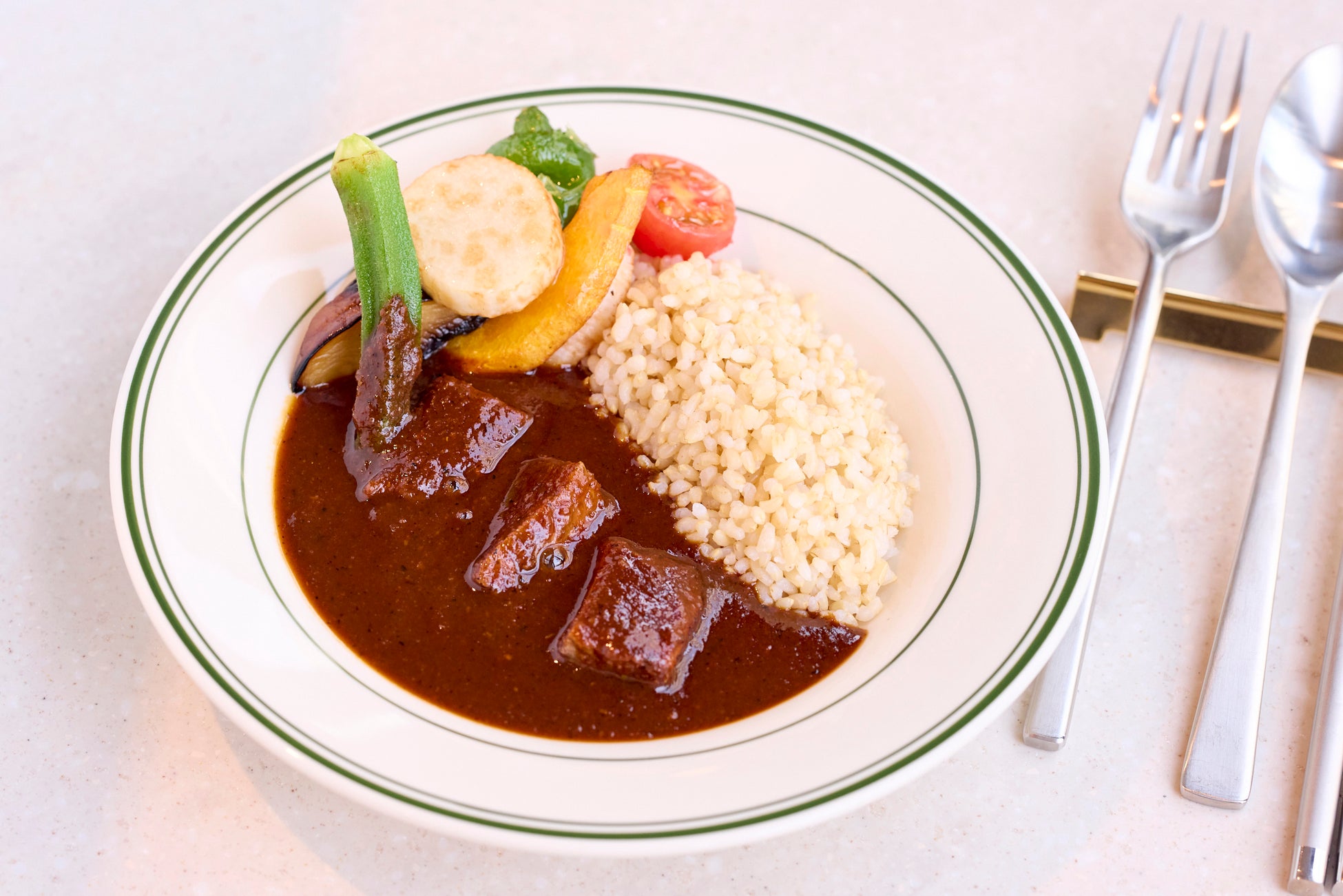 スパイスカレー文化のある関西の方のお口に合うように欧風カレーのスパイスを13種類程度使用し、カルダモンをアクセントにしたやみつきになる一品。関西地域の農家から取り寄せた新鮮な季節の野菜を添えて。