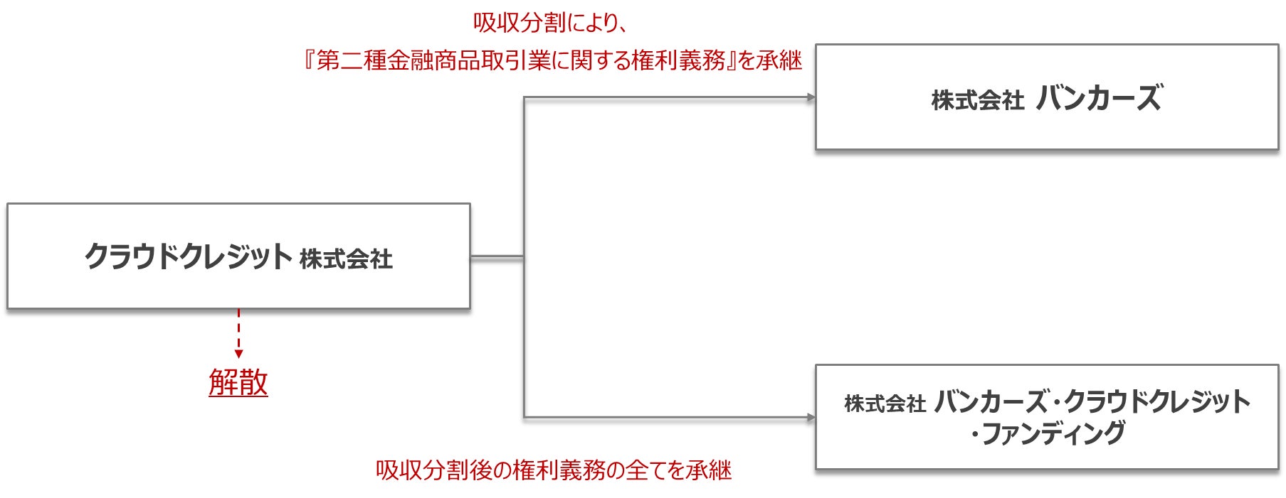 株式会社バンカーズ・ホールディング(本社:東京都中央区、代表取締役:澁谷 剛、以下「当社」)は、子会社であるクラウドクレジット株式会社(本社:東京都中央区、代表取締役:岩田 郷、以下「クラウドクレジット」)について、2024年4月1日をもって、第二種金融商品取引業に関する権利義務を、吸収分割により株式会社バンカーズ(本社:東京都中央区、代表取締役:遠藤 慎一、以下「バンカーズ」)に承継させ、併せて、当該吸収分割後の権利義務の全てを、吸収合併により株式会社バンカーズ・クラウドクレジット・ファンディング(本社:東京都中央区、代表取締役:倉本 容実、以下「バンカーズ・クラウドクレジット・ファンディング)に承継させることにより、解散することをお知らせいたします。