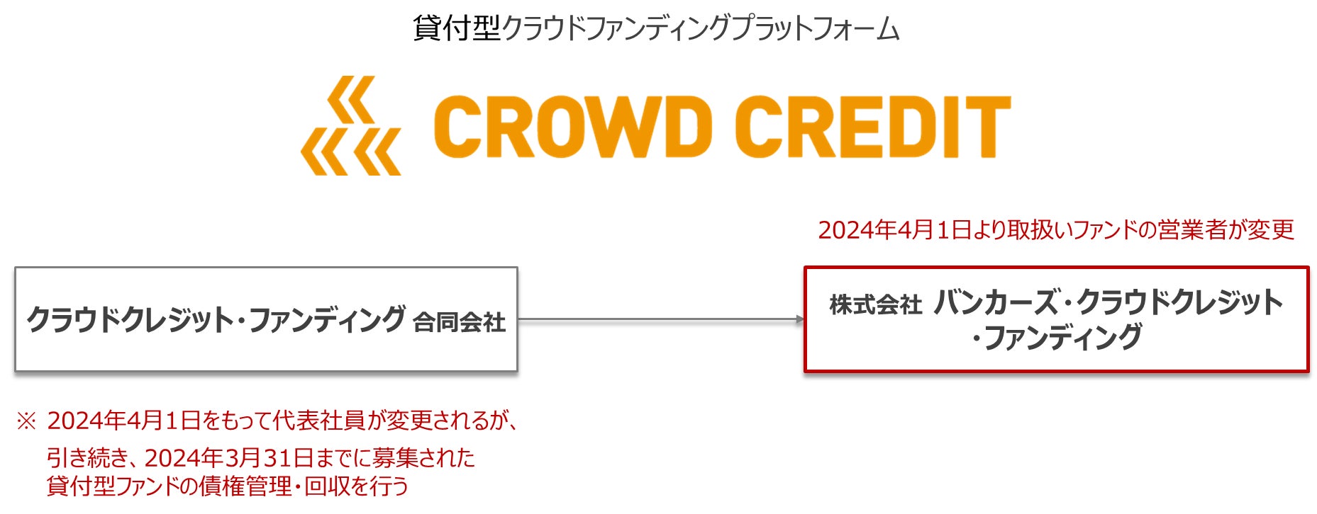 2024年3月31日までに『CROWD CREDIT』で募集された貸付型ファンドの営業者は、クラウドクレジット・ファンディング合同会社(本社:東京都中央区)のまま変更はございませんが、2024年4月1日をもって、同社の代表社員はクラウドクレジットからバンカーズ・クラウドクレジット・ファンディングに変更となります。組成ファンドに係る、貸付債権の管理・回収は引き続き同社が行ってまいります。
