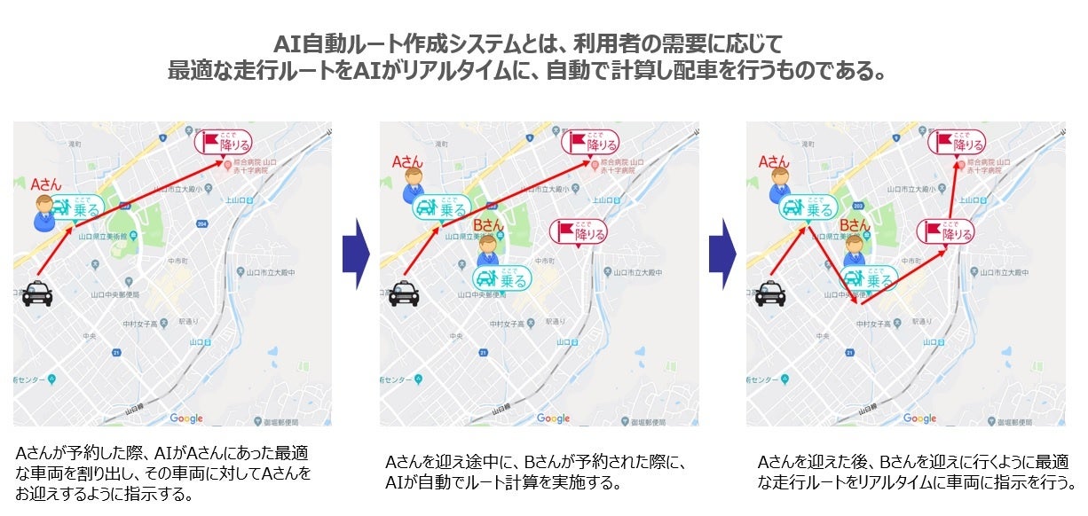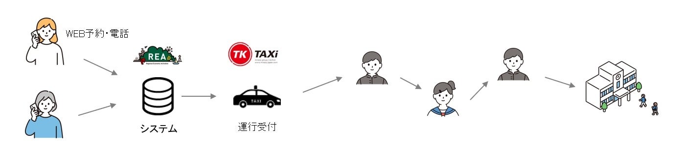 親御さんが確認出来るWEB専用アプリを通じてTKタクシーに対しREAが提供するAI乗合配車システムを経由し、乗車予約することができます。また予約内容を基にAIが効率のよい運行ルートを自動作成してタクシー乗務員へ通知するので、タクシー事業者は業務負担少なく運行が可能になります。
