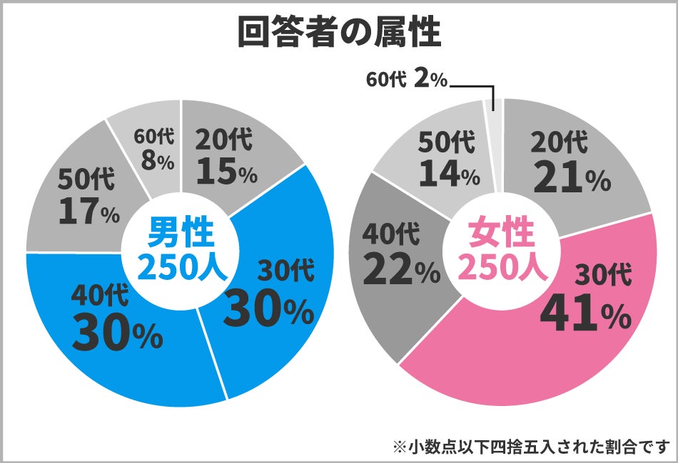 今回のアンケートに答えてくれたのは男性250人、女性250人の合計500人で、それぞれの年齢の割合は以下の通りです。