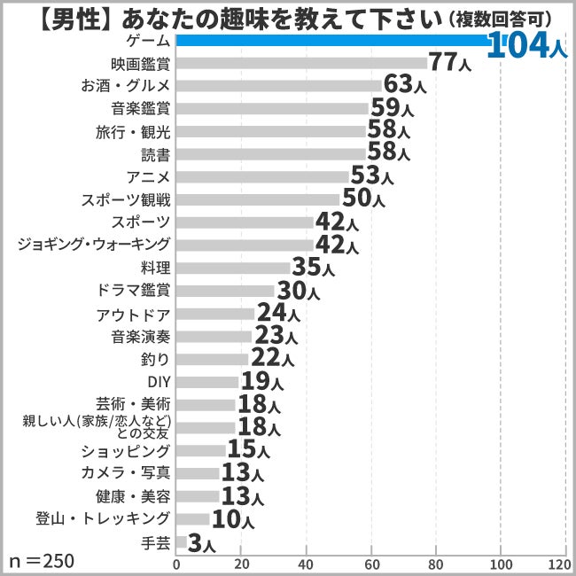 男性250人に「あなたの趣味を教えてください」と伺ったところ、第1位は圧倒的多数で「ゲーム」でした。