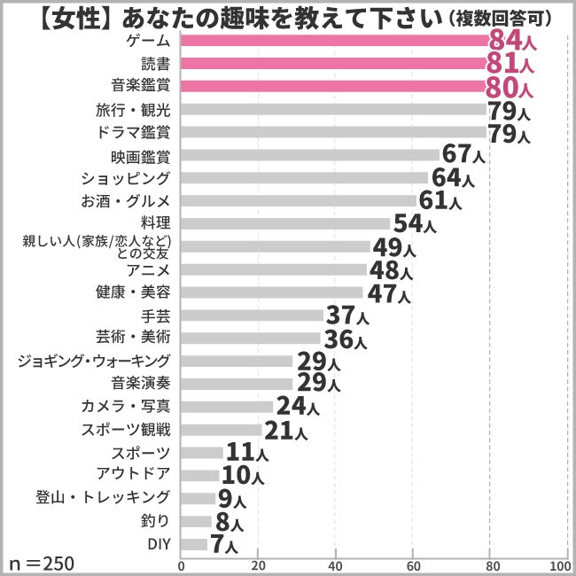 女性の回答の第1位も「ゲーム」ですが、2位「読書」と3位「音楽鑑賞」を含めた上位3位はいずれも僅差で、ほとんど同着と言ってもいいくらいです。