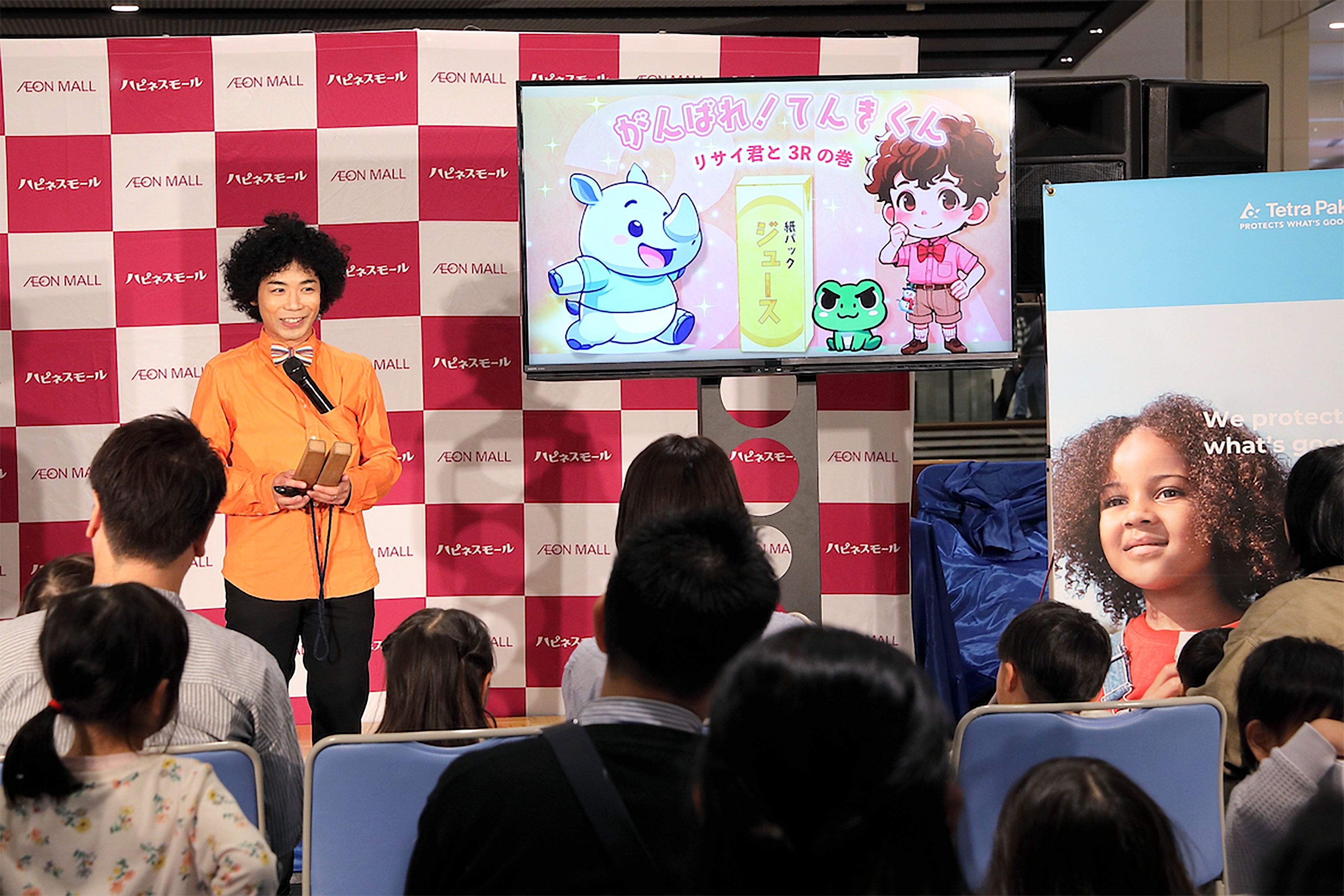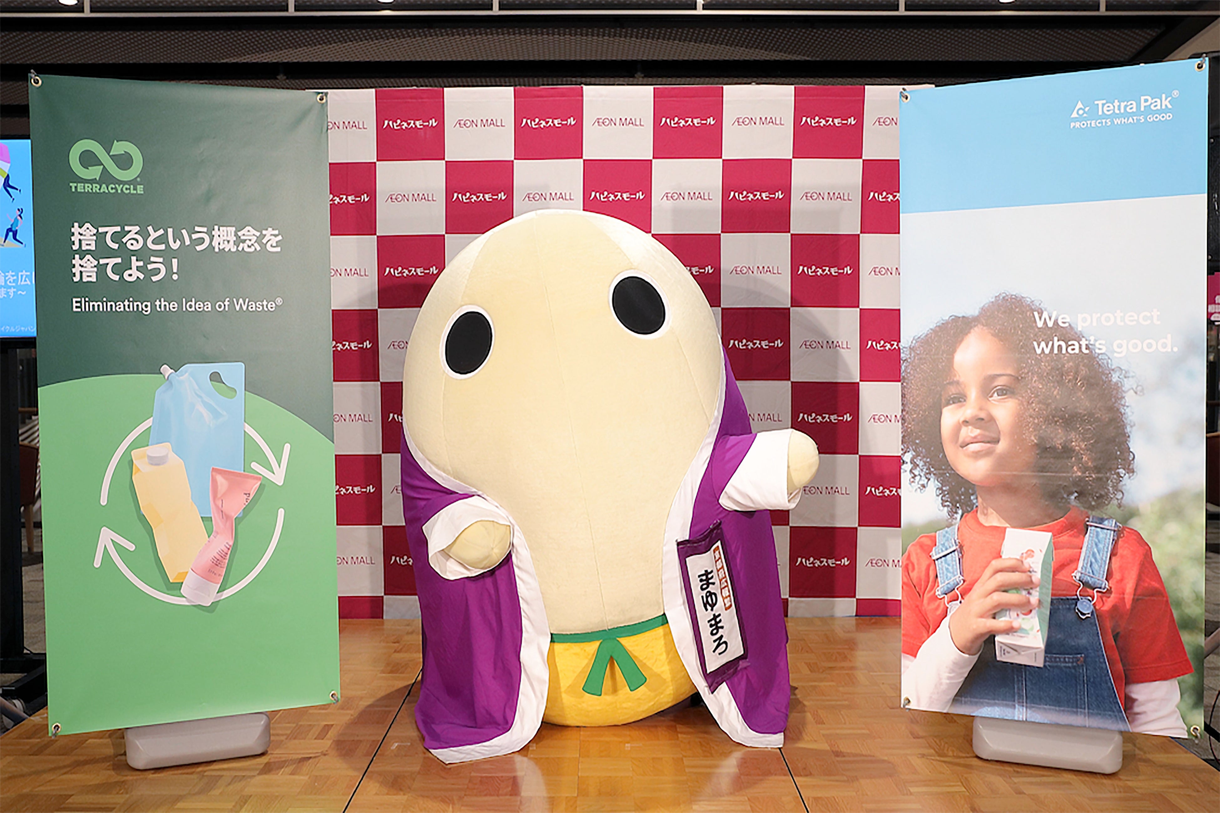 日本テトラパック代表取締役社長 アレハンドロ・カバル、イオンリテール近畿カンパニー支社長 川本昌彦氏、テラサイクルジャパン代表 エリック・カワバタ氏に加えて、本取り組みをサポート頂いている京都府副知事 山下晃正氏にもご登壇いただき、イオンの一部店舗におけるアルミ付き紙パック回収のスタートを宣言。京都府公認キャラクターまゆまろと一緒に、スペシャルゲストとして、気象予報士、防災士で紙芝居師でもあるくぼてんき氏によるパフォーマンスや、総合地球環境学研究所 教授の淺利美鈴氏をお招きしたトークショーも行いました。