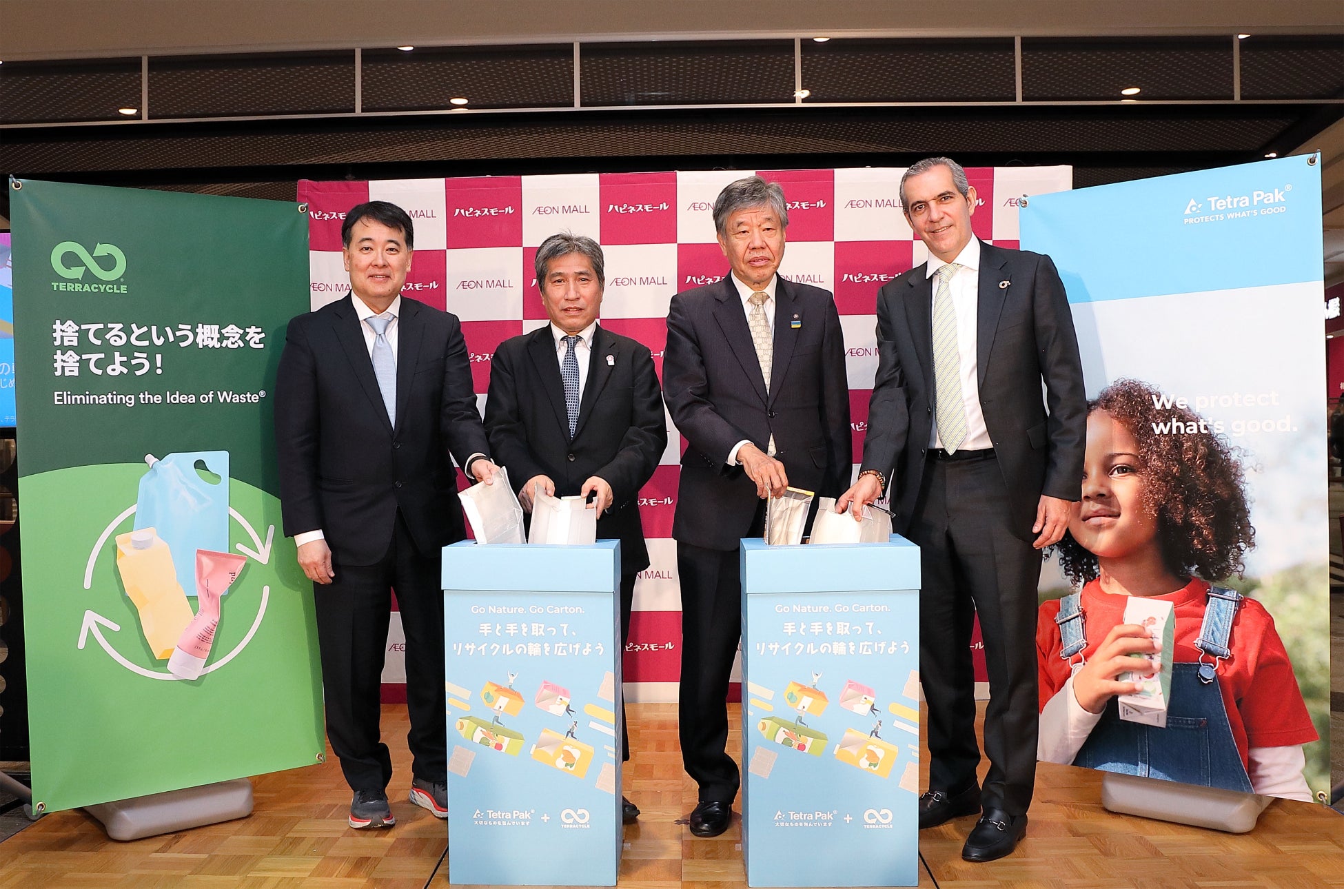 (左から)テラサイクルジャパン代表 エリック・カワバタ氏、イオンリテール近畿カンパニー支社長 川本昌彦氏、京都府副知事 山下晃正氏、日本テトラパック代表取締役社長 アレハンドロ・カバル