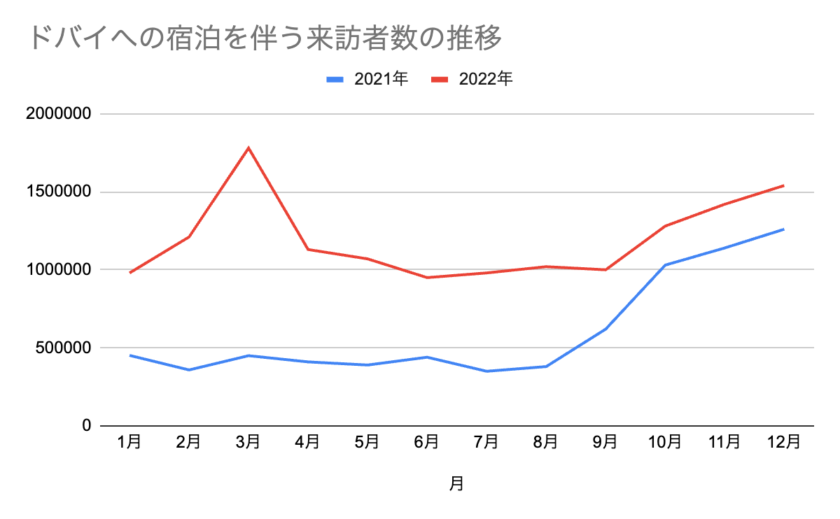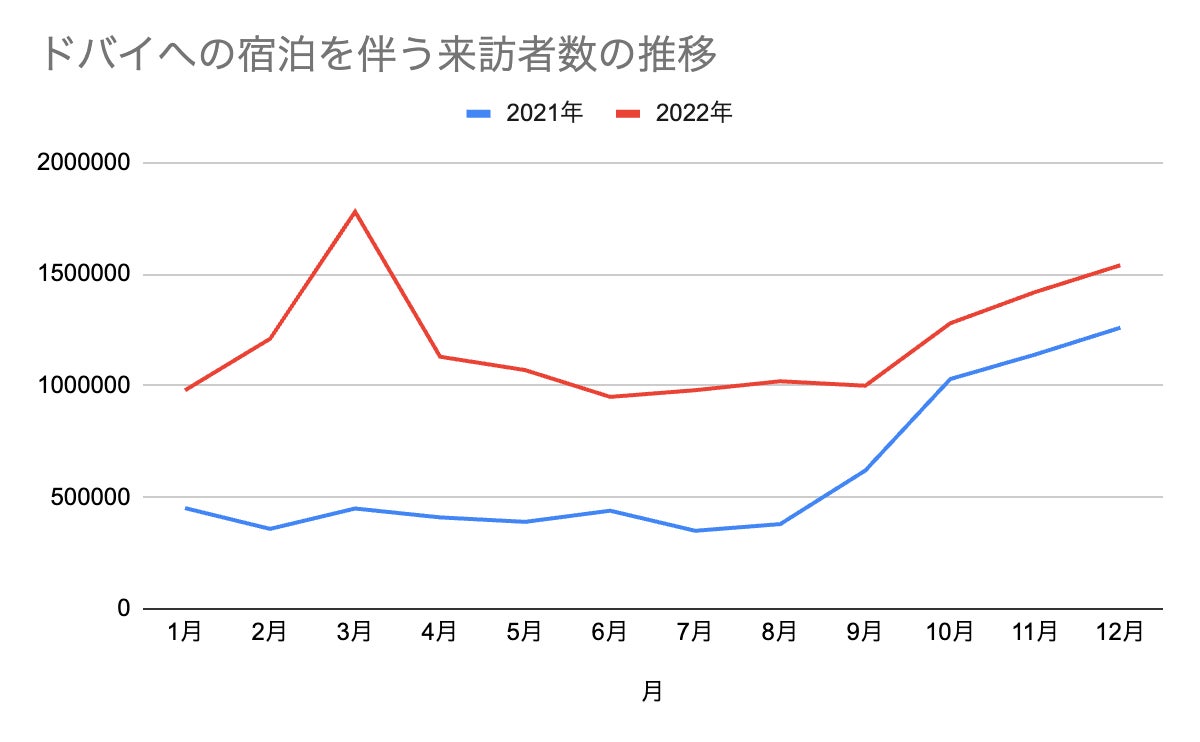 2021年と2022年のドバイへの宿泊を伴う来訪者数を比較した結果、2022年のほうが増加していることがわかりました。また、2023年上半期のドバイへの宿泊を伴う来訪者数は855万人で、前年同期の712万人から20.1%増加。2023年は来訪者数が過去最多になると予想されています。
