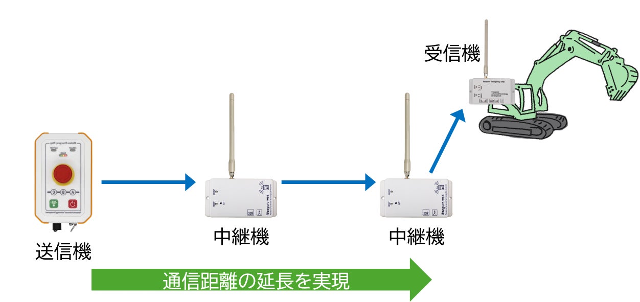 従来の通信距離は見通し環境で300mでしたが、複数台の中継機を経由することで、通信距離を大幅に拡張できます。これにより、土木・建設現場など、機械と遠く離れた場所からでも、非常停止信号を確実に届けます。