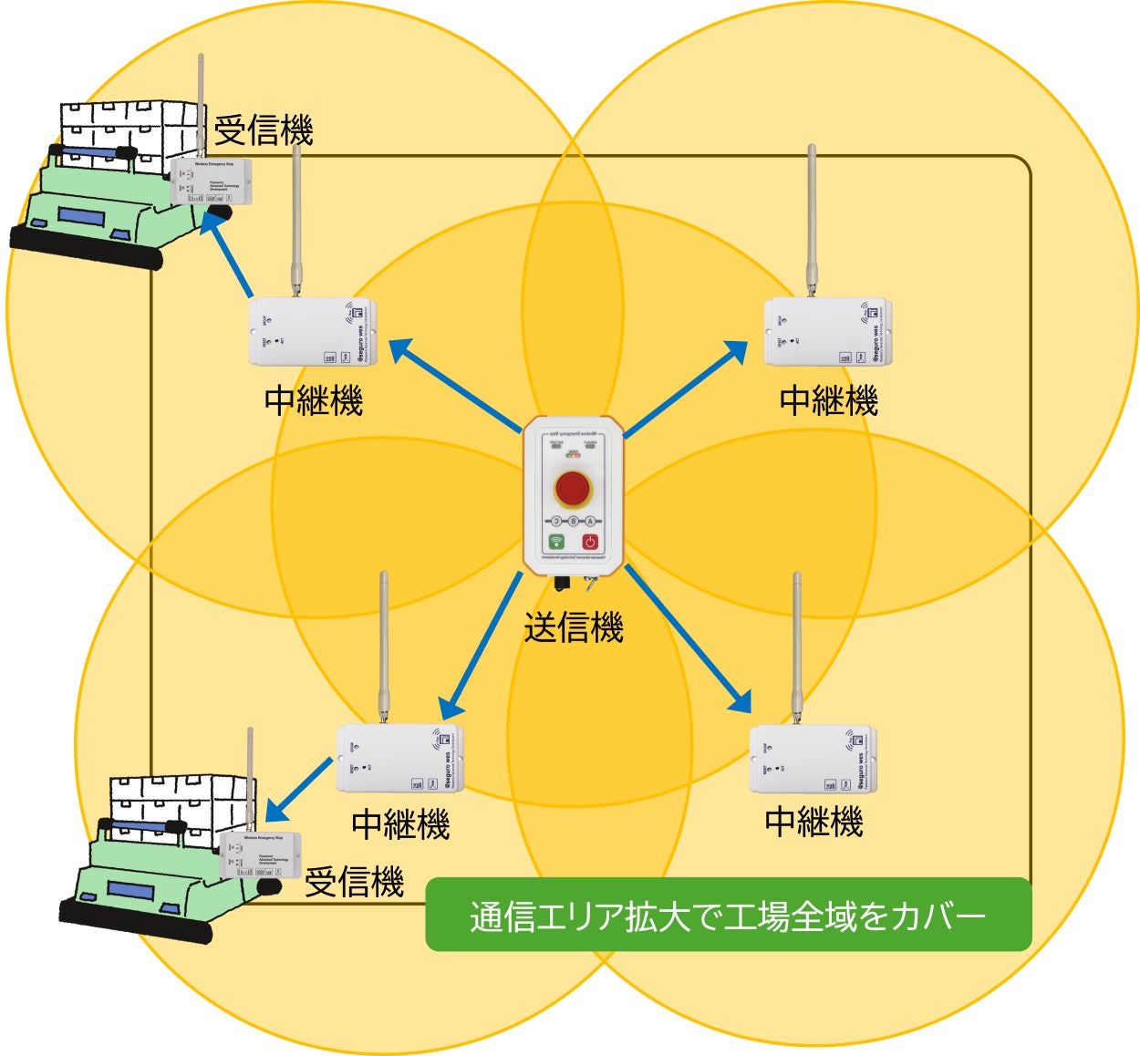 中継機を設置することで、これまで届かなかった死角やエリアにも非常停止信号を確実に伝達できます。工場全体をカバーする無線ネットワークを構築でき、どこにいても「止めたいときに止められる」安心を提供します。