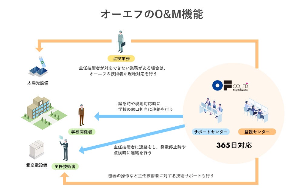 本プロジェクトにおいて、当社は導入された太陽光発電設備ならびに蓄電池のO&M(運用・保守)を担当。365日対応のサポートセンター・監視センターを活用し、主任技術者への技術サポートと、必要に応じて現地保守網を利用することで、太陽光発電設備の持続的かつ安定した運用を確保します。