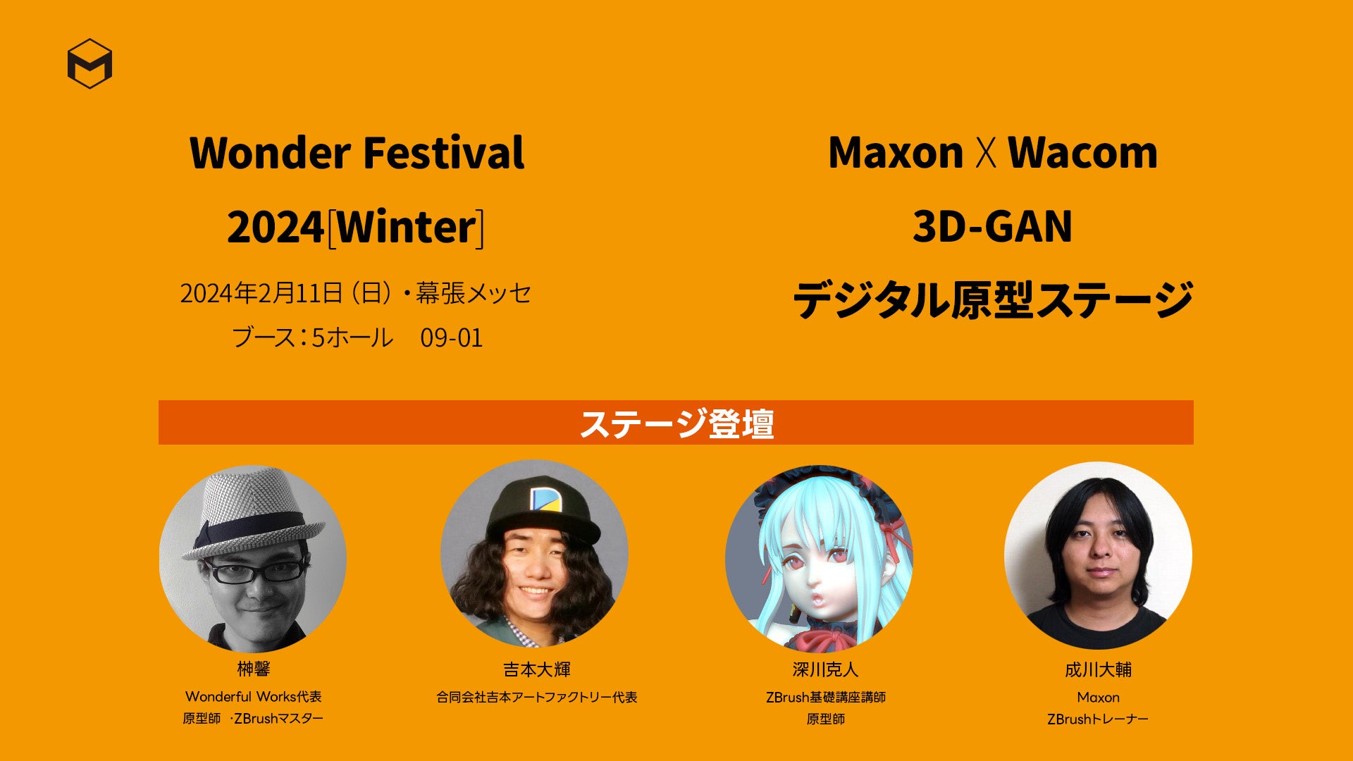 特設ステージの「Maxon X Wacom 3D-GAN デジタル原型ステージ」では、原型師 ・ZBrushマスターである榊馨さんと3D造形/デザイナーの吉本大輝さん、ZBrush基礎講座講師/原型師である深川克人さん、MaxonのZBrushトレーナーである成川大輔の4名が、これからデジタル造型を始め方や生物の復元、ZBrushでフィギュア制作のテクニックなど解説する講座を開催します。