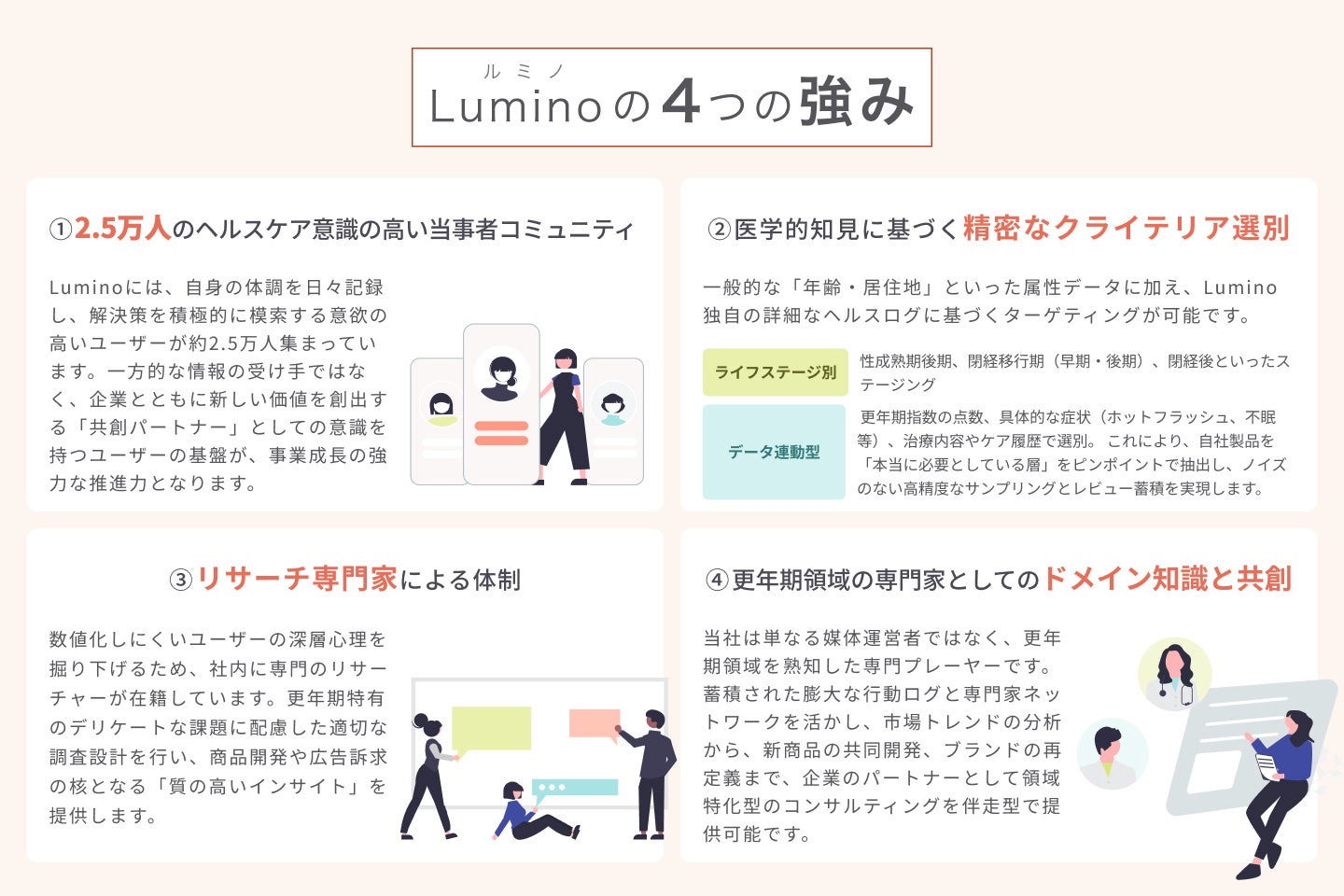 同様に、企業側も「ターゲット層に的確なメッセージが届かない」「深いインサイトが得られない」という、更年期市場特有のマーケティングの難しさに直面しています。ルミノは、信頼できるリアルな体験談が循環するプラットフォームを構築することで、ユーザーの情報格差を解消すると同時に、企業が「本当に届けたい層」へ確実にアプローチできる場を提供し、両者を繋ぐ架け橋となります。
