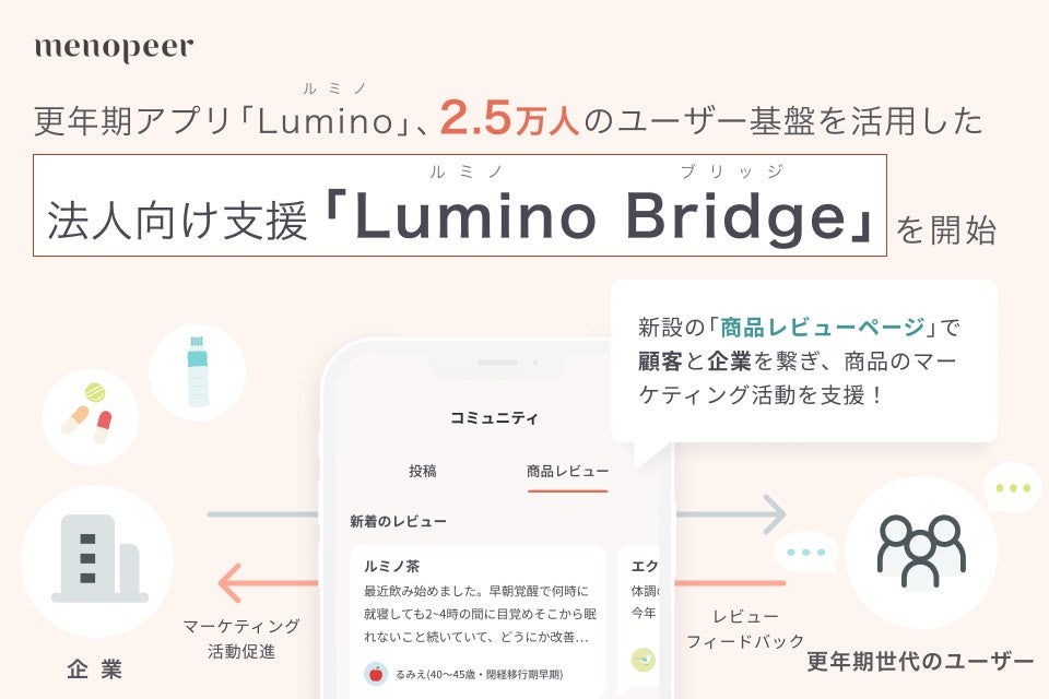 更年期アプリ「Lumino(ルミノ)」、2.5万人のユーザー基盤を活用した法人向け支援『Lumino Bridge』を開始。 新設の商品レビューページで顧客と企業を繋ぎ、更年期市場のミスマッチを解消