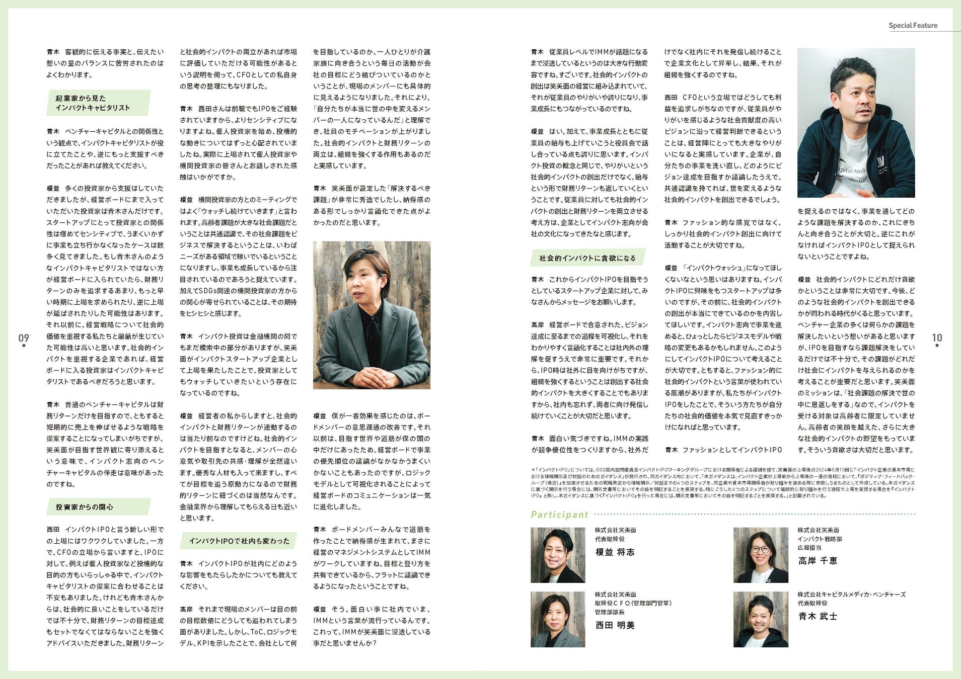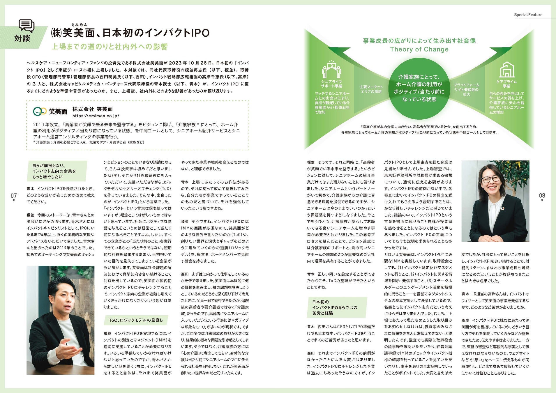 また、特別企画として、日本初のインパクトIPOを達成した株式会社笑美面の代表取締役・榎並 将志氏、取締役CFO(管理部門管掌)管理部部長 西田 明美氏、インパクト戦略部広報担当 高岸 千恵氏と、CMV代表取締役の青木による会談を行い、インパクトIPO に至るまでにどのような準備や苦労があったのか、また、上場後、社内外にどのような影響があったのかについて語っています。