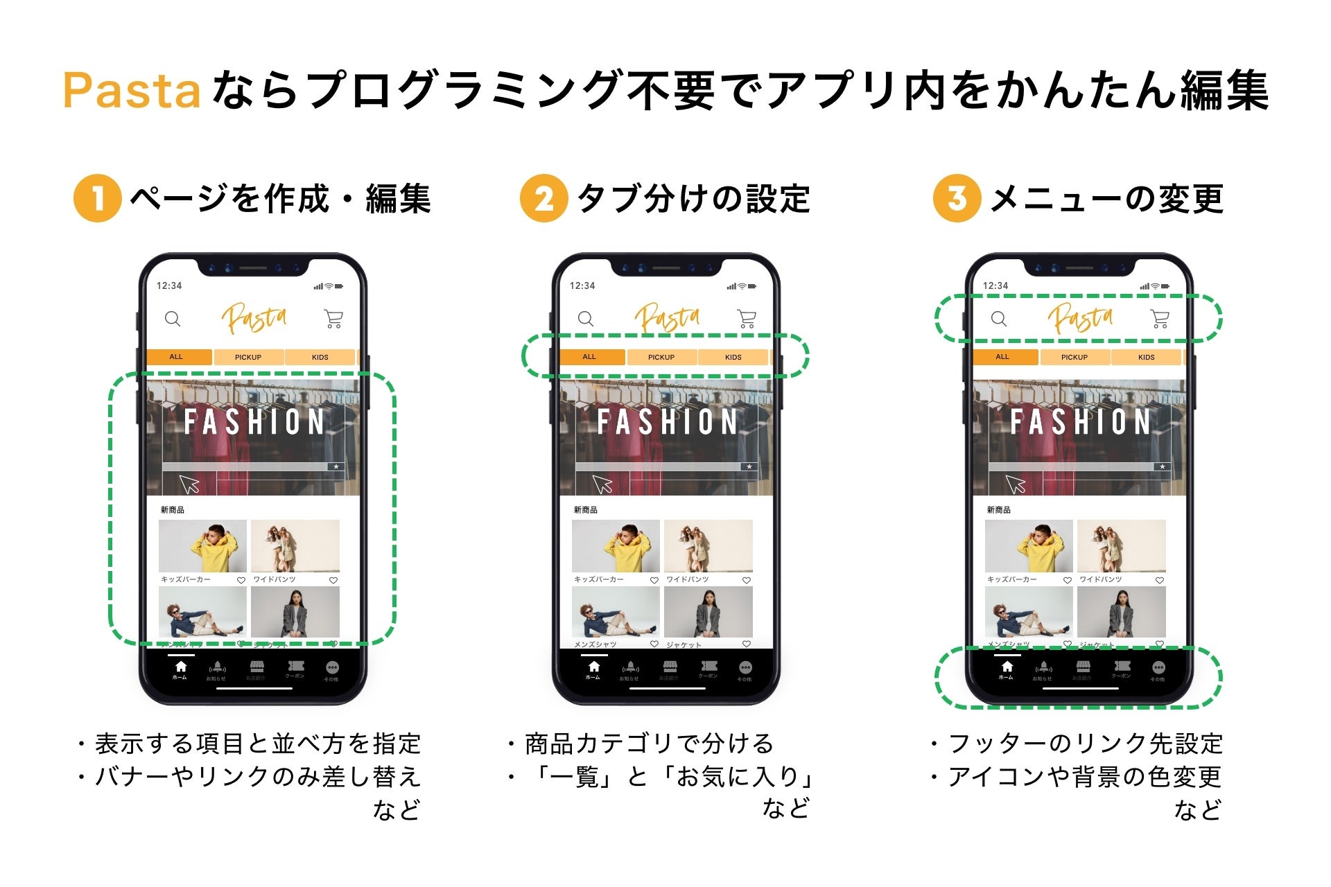 Pasta でアプリを構築すると、プッシュ配信・お知らせ配信といったマーケティング施策はもちろん、店舗情報管理・掲載バナー変更・デザイン変更なども管理画面からプログラミング不要で行えます。