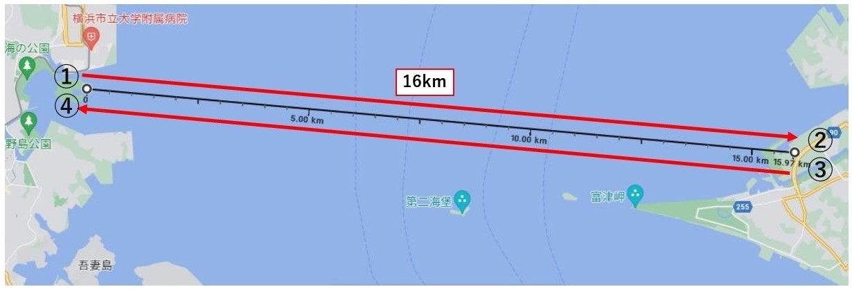 ④ 富津みなと公園から横浜市八景島までの16kmを帰還飛行