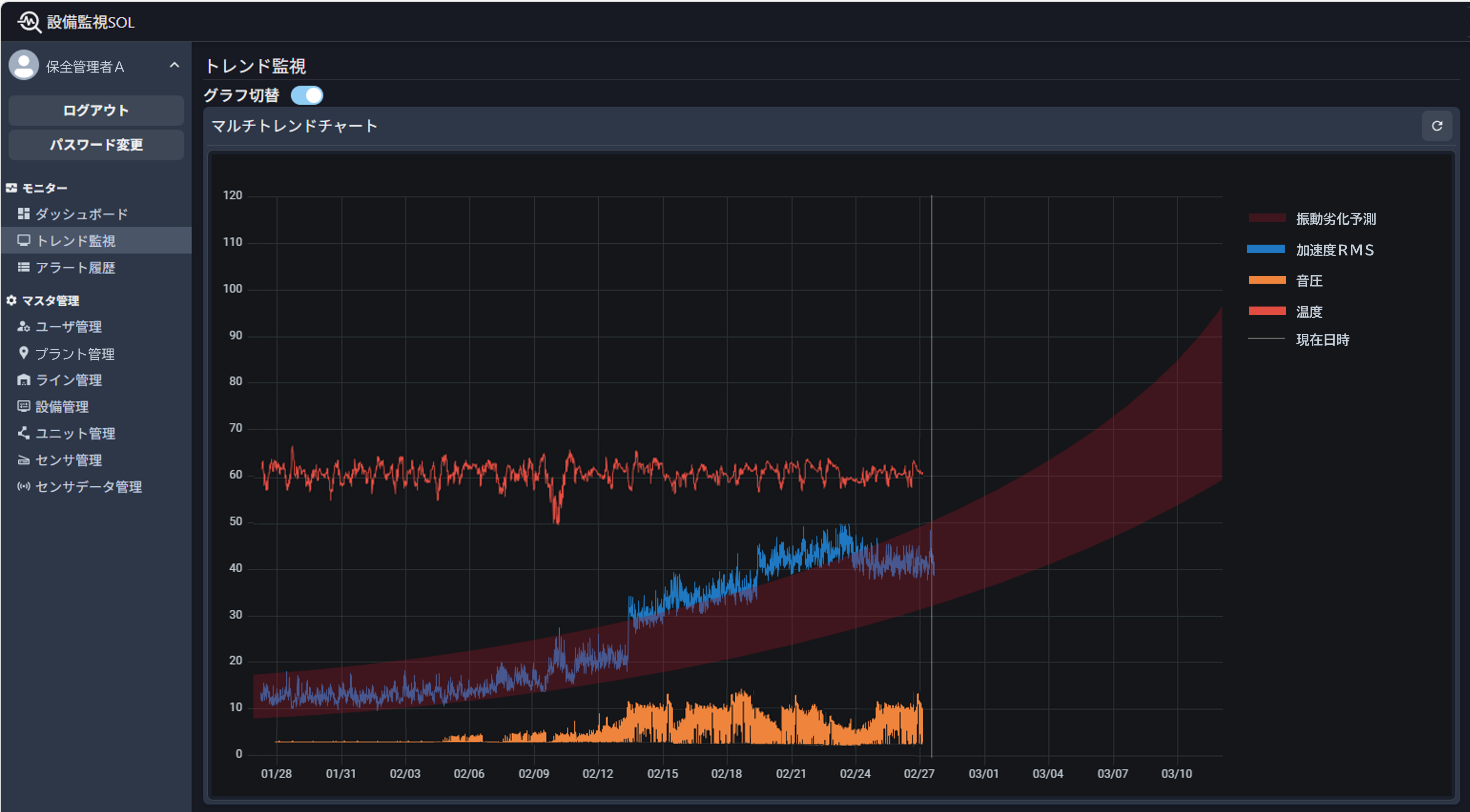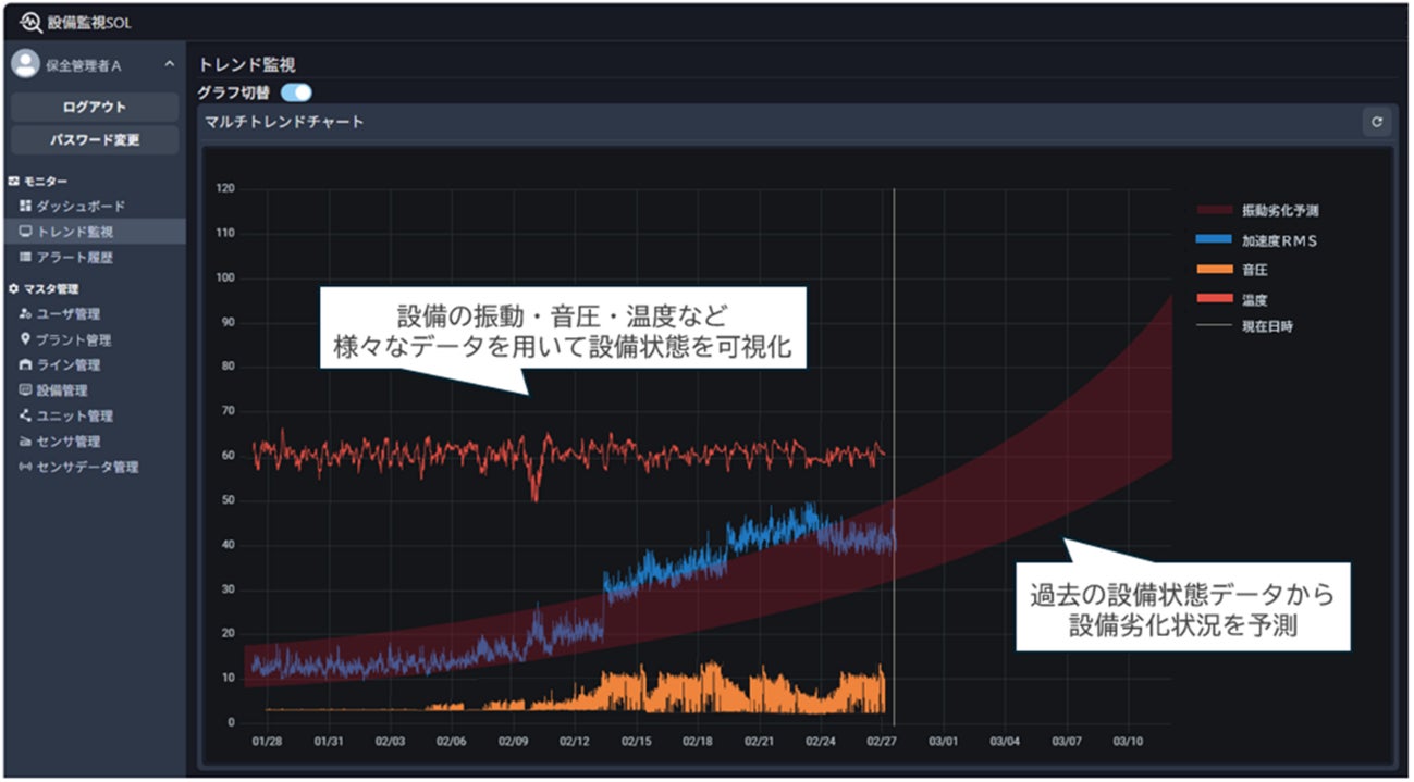 このたび構築した予知保全システムは、熟練の従業員が培ってきた経験・暗黙知や、各設備の音・振動などの測定データ、実際に設備に発生した異常事象をもとに、故障の初期兆候を可視化します。また、蓄積されたデータを活用し、故障タイミングを予測するモデルも組み込まれています。
