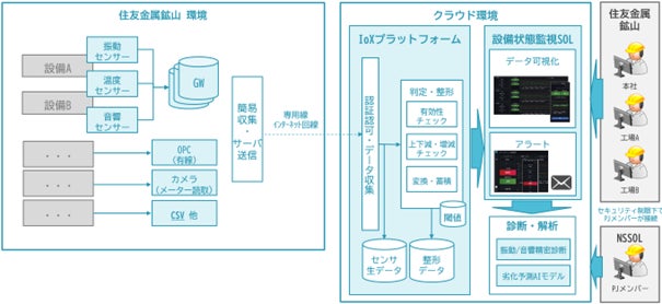 住友金属鉱山が熟練の従業員の暗黙知などの提供を行い、NSSOLが自社開発のIoXプラットフォーム(注)と設備状態監視ソリューションを導入しました。このソリューションは、センサーデータや各種OTデータを一元的に格納し、大規模時系列データに対応できる拡張性や、クラウドアーキテクチャによるアクセス利便性などの特長があります。また、日鉄テックスエンジは、長年の設備保全業務で培ったノウハウを活用し、各故障事象に対するセンサー設置とデータ収集方法を決定しました。