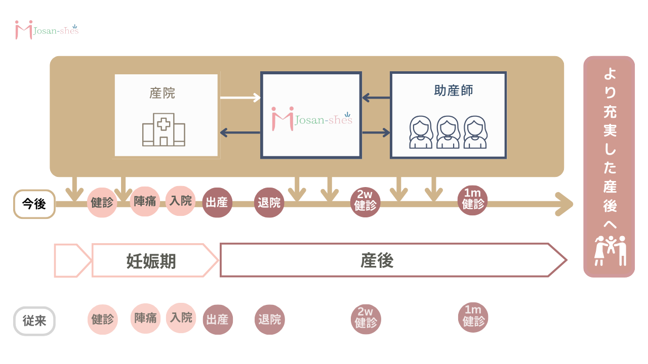 ジョサンシーズは、助産師登録者数がトップクラスであり、代官山バースクリニックと協力して、助産師を中心としたオンラインとオフラインのサービスを提供していきます。