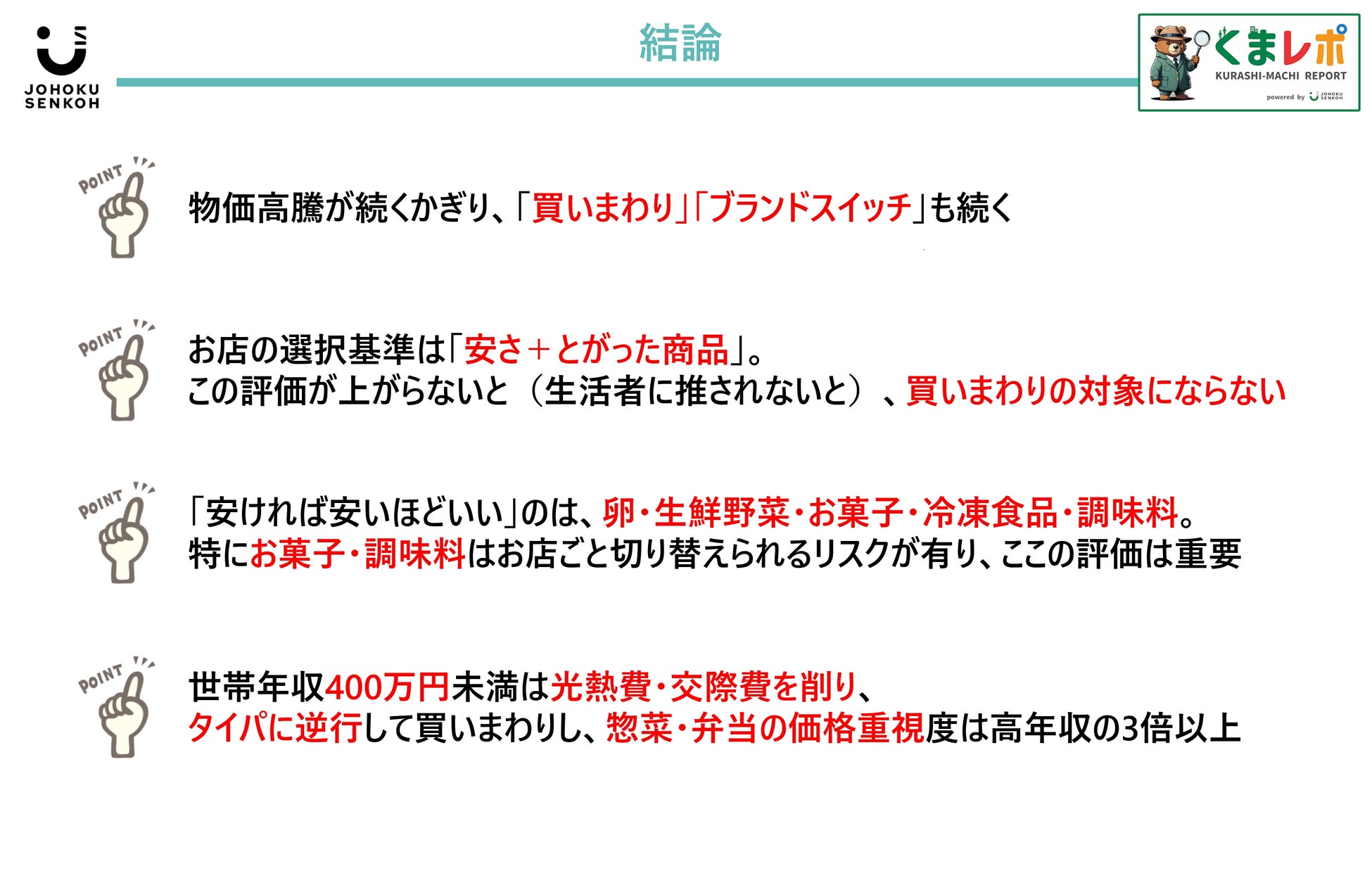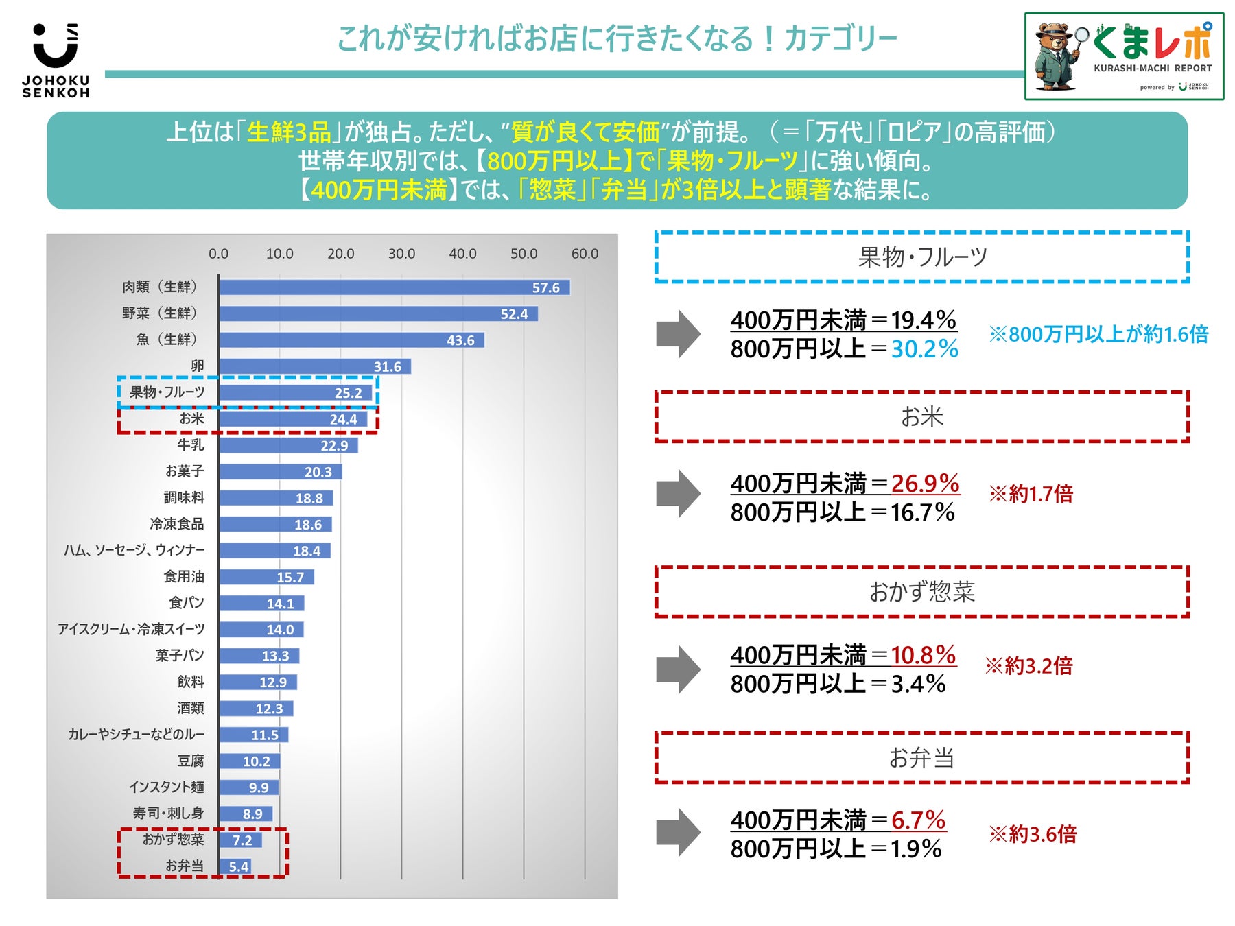 ・総合すると、「卵」「生鮮野菜」「お菓子」「冷凍食品」「調味料」に安さが求められている