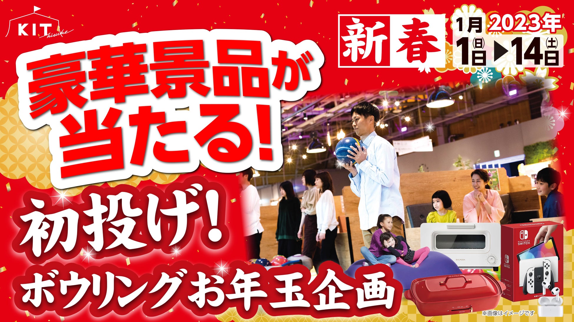 新春の初あそびは家族揃って、四国最大のエンターテイメント複合施設・キスケKITの「初投げボウリング」に行こう!宝くじを集めて豪華景品GETのチャンスも!
