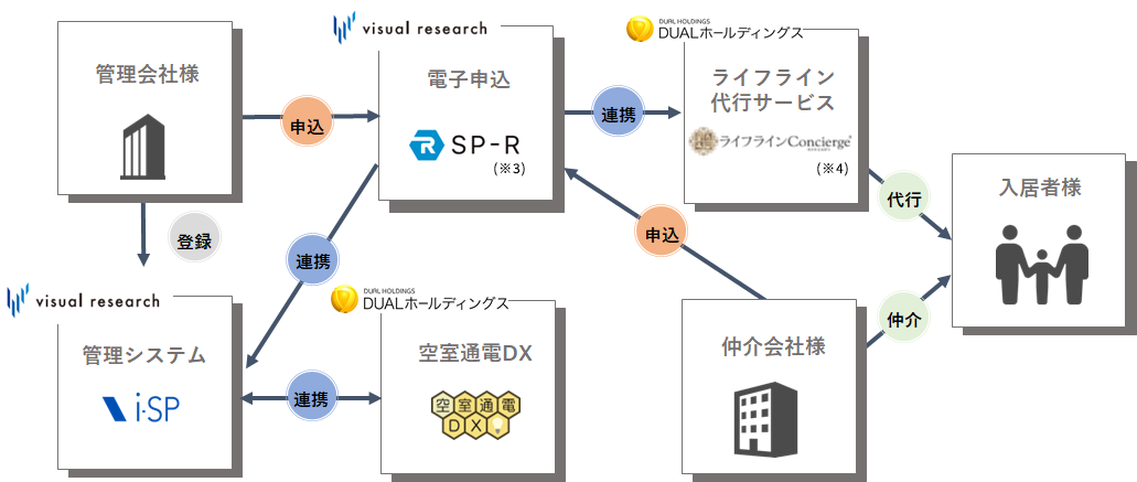 物件入居に係る電子申込と同時に、入居時に必要なライフラインの手続きも行えるようになり、入居者の利便性向上を図ることができることに加え、ビジュアルリサーチが提供する賃貸管理システム「i-SP」に登録されている物件情報を、DUALホールディングスが提供する「空室通電DX」へAPI連携することで自動的な通電および停止が可能となります。