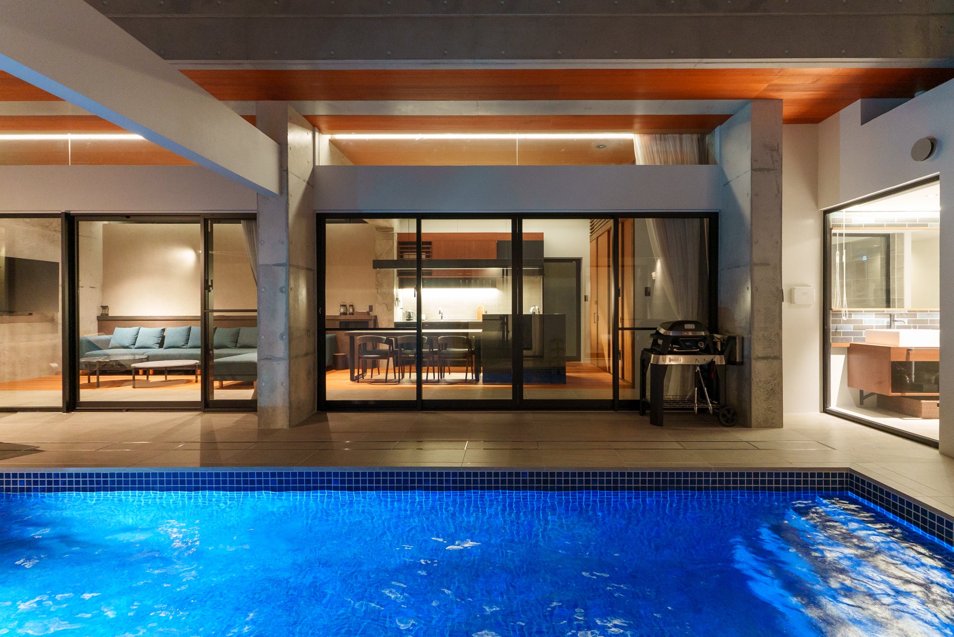 建物の中心には開放感あふれる中庭プールが広がり、それを囲むようにリビングダイニング、バスルーム、そして3つの寝室をレイアウト。すべての部屋から直接プールへアクセス可能な設計により、まるで南国リゾートを独占しているかのような特別なひとときをお楽しみいただけます。