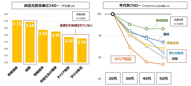 9. 派遣元で、キャリアの時間軸、セルフ・アウェアネスに影響していたキャリア相談、学びへの助言はともにあまり実施されていない。特に、キャリア相談・傾聴・学びの助言は、年齢を重ねるとより実施されなくなっていく傾向が見られた。