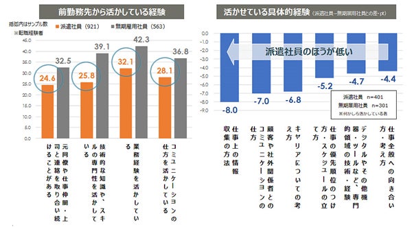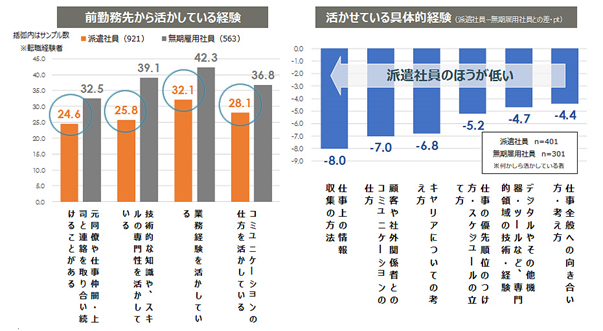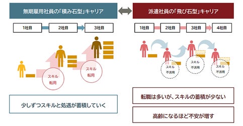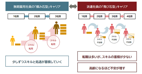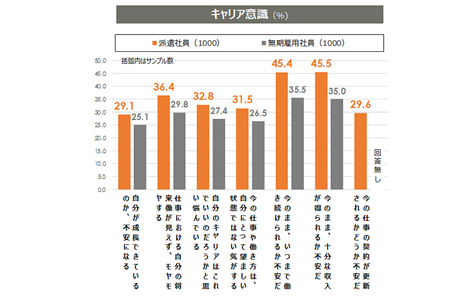 派遣社員の学び意欲は潜在的には低くなく、過去には無期雇用社員で働いた経験がある者も多い。にもかかわらず、キャリアの時間意識の短さと自己認識(セルフ・アウェアネス)が低く、キャリア不安が強い状態にある。そうしたキャリア意識を背景に、得たスキルが次の職場で活かされておらず、「飛び石」のような非連続的なキャリアを歩んでいる。