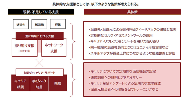 学習機会や情報を提供するだけでは、こうしたキャリアの在り方を変化させることは難しい。必要なのは、キャリアの時間意識、自己認識を高めるための支援であるが、現在は効果的な振り返りの支援やネットワーク支援ほど不足している。派遣先・派遣元企業・行政が連携し、キャリアサポートをより手厚くしていくことが求められる。労働力不足の深刻化とともに、外部人材リソースを戦略的に活用することの重要性は増している。賃上げなどで人への投資が拡大する流れの一方で、派遣社員がコストの調整弁として使われるようなことは避けられるべきである。派遣社員の蓄積的なスキル向上を実現し、魅力的なキャリアの幅を広げるために本調査が参考になれば幸いである。