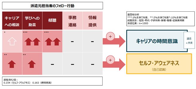 8. 派遣元担当者のフォローとキャリアの時間軸、セルフ・アウェアネスとの関係を分析すると、キャリアへの相談、学びへの助言はともにキャリアの時間軸、セルフ・アウェアネスにプラスの影響が見られた。事務連絡や情報提供だけでは、それらにプラスの影響は確認できない。