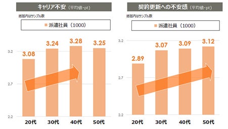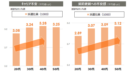 4. 派遣社員は無期雇用社員と比べ、キャリアへの不安が全般的に高く、年齢を重ねるごとに不安感が微増する傾向。