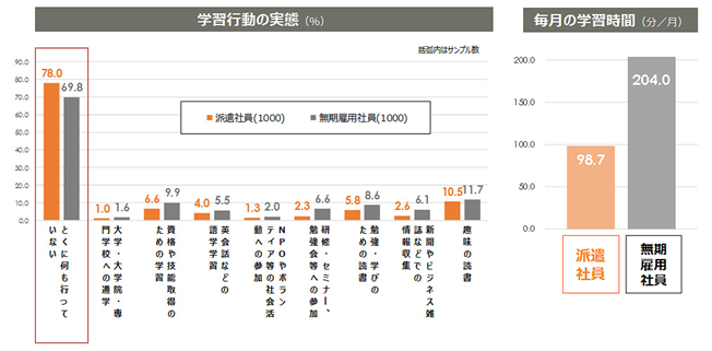 2. 学習行動については、派遣社員の78.0%が「特に何も行っていない」。学習時間も無期雇用社員のほうが約2倍多い。