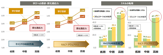 5. 学び意欲向上のためには、自分のキャリアについて、いかに「過去」「未来」の時間軸で考えているかを表す「キャリアの時間感覚(意識)」と自己と仕事に関する「セルフ・アウェアネス(自己認識)」が重要。これらはスキルの転用・蓄積にもプラスの効果。