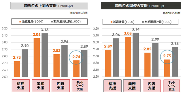 7. 職場での上司・同僚からのサポート・支援の実態をみると、派遣社員の職場支援は、「業務支援(仕事にかかわる支援)」に偏っており、「精神支援(プライベート含む悩み相談)」も、「内省支援(振り返りの支援)」も低い。中でも、ネットワーク支援は最も手薄になっている。 ※各支援の尺度については報告書のP48を参照