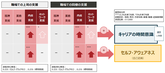 6. 派遣先の職場での支援とキャリアの時間軸、セルフ・アウェアネスとの関係を見ると、上司・同僚の内省支援が、キャリアの時間軸、セルフ・アウェアネスにプラスの影響が見られた。ネットワーク支援も一部を除いて同様の傾向がみられる。