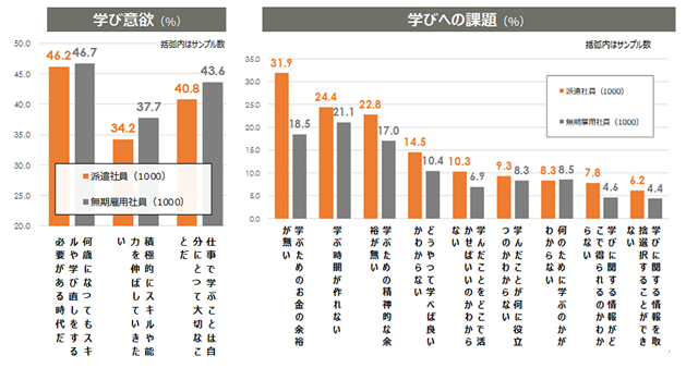 1. 学びへの全般的な意欲は、派遣社員と無期雇用社員で大きな差は見られないが、学びへの課題については、派遣社員は「学ぶためのお金の余裕」への課題感が高い。