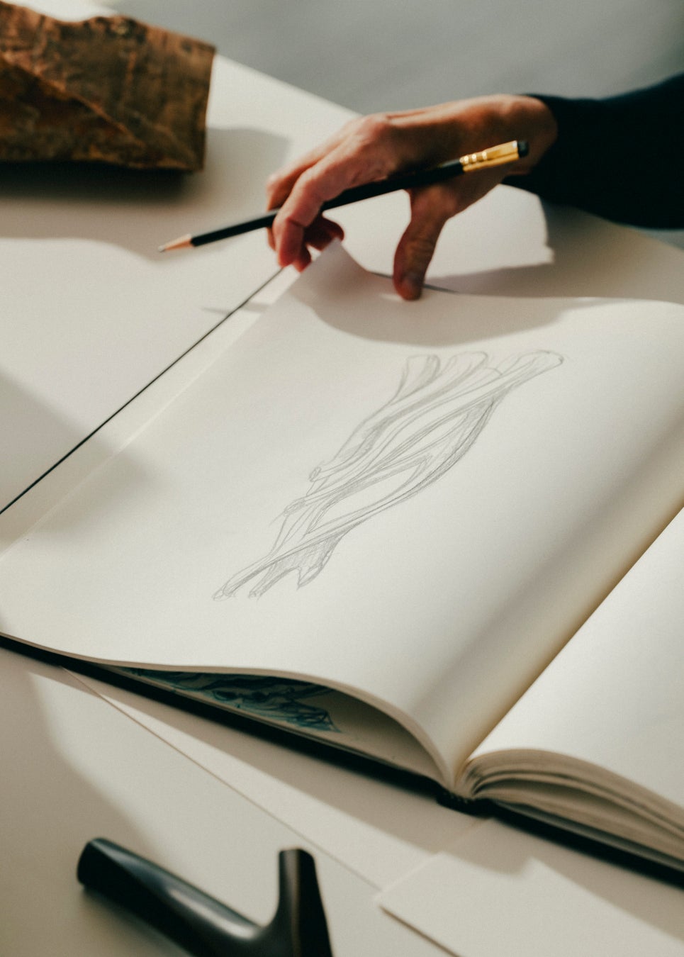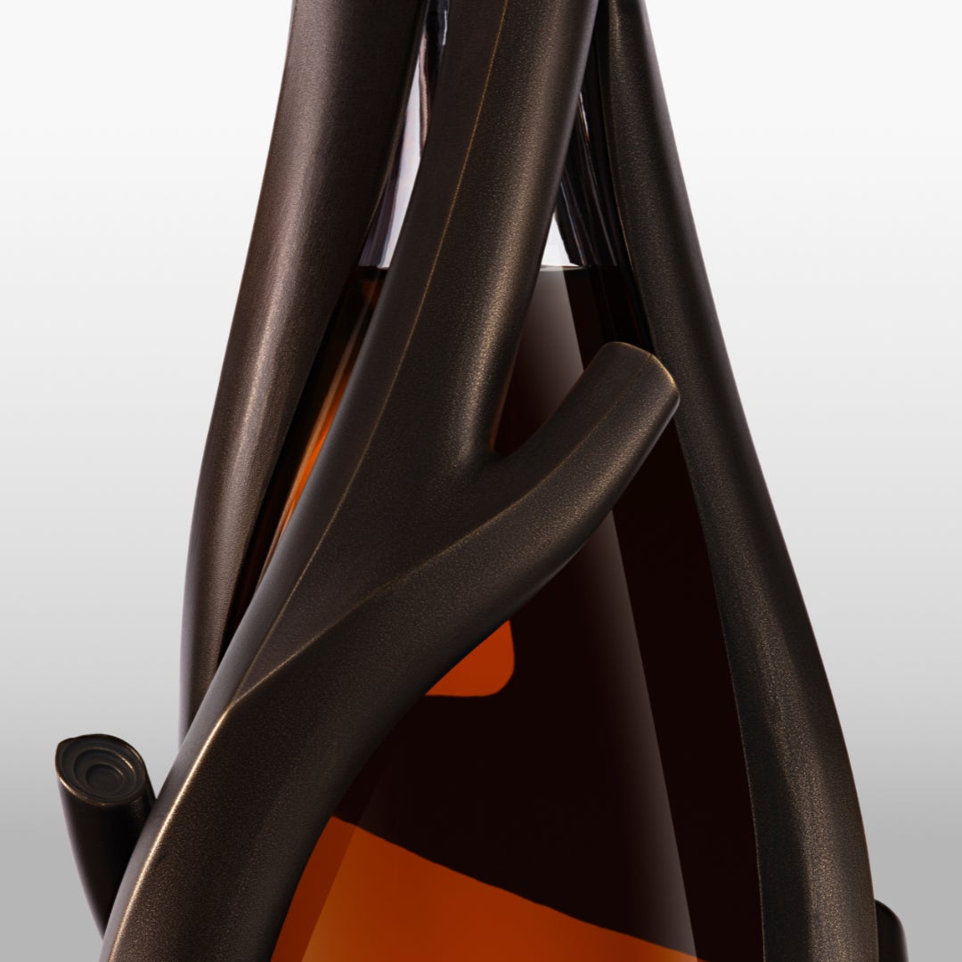 ブロンズ製の4本の枝が螺旋を描きながら上昇し、琥珀色の液体を包み込むデキャンタは、樹木が長い時をかけて宝を育む姿を象徴しています。