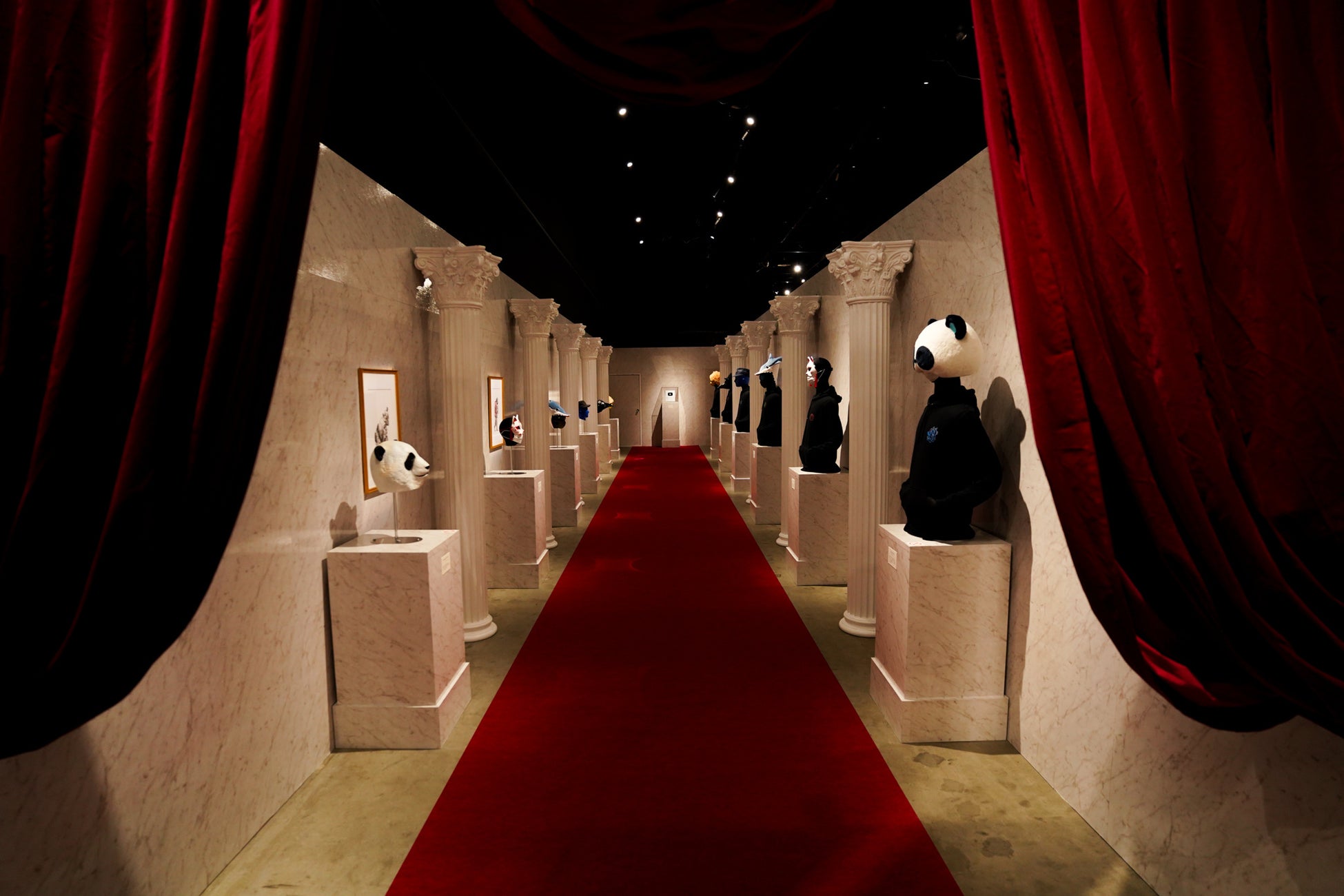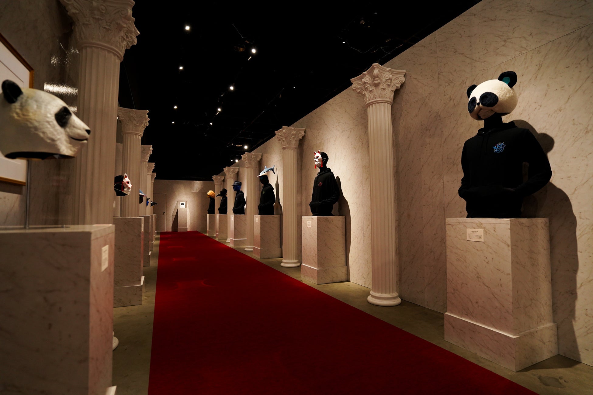 第一展示室はまるで博物館のメインフロアのような豪華ムード。展示品はメンバーが実際に使用しているマスクとなっており、新旧の移り変わりを比較しながらじっくり観察できる。
