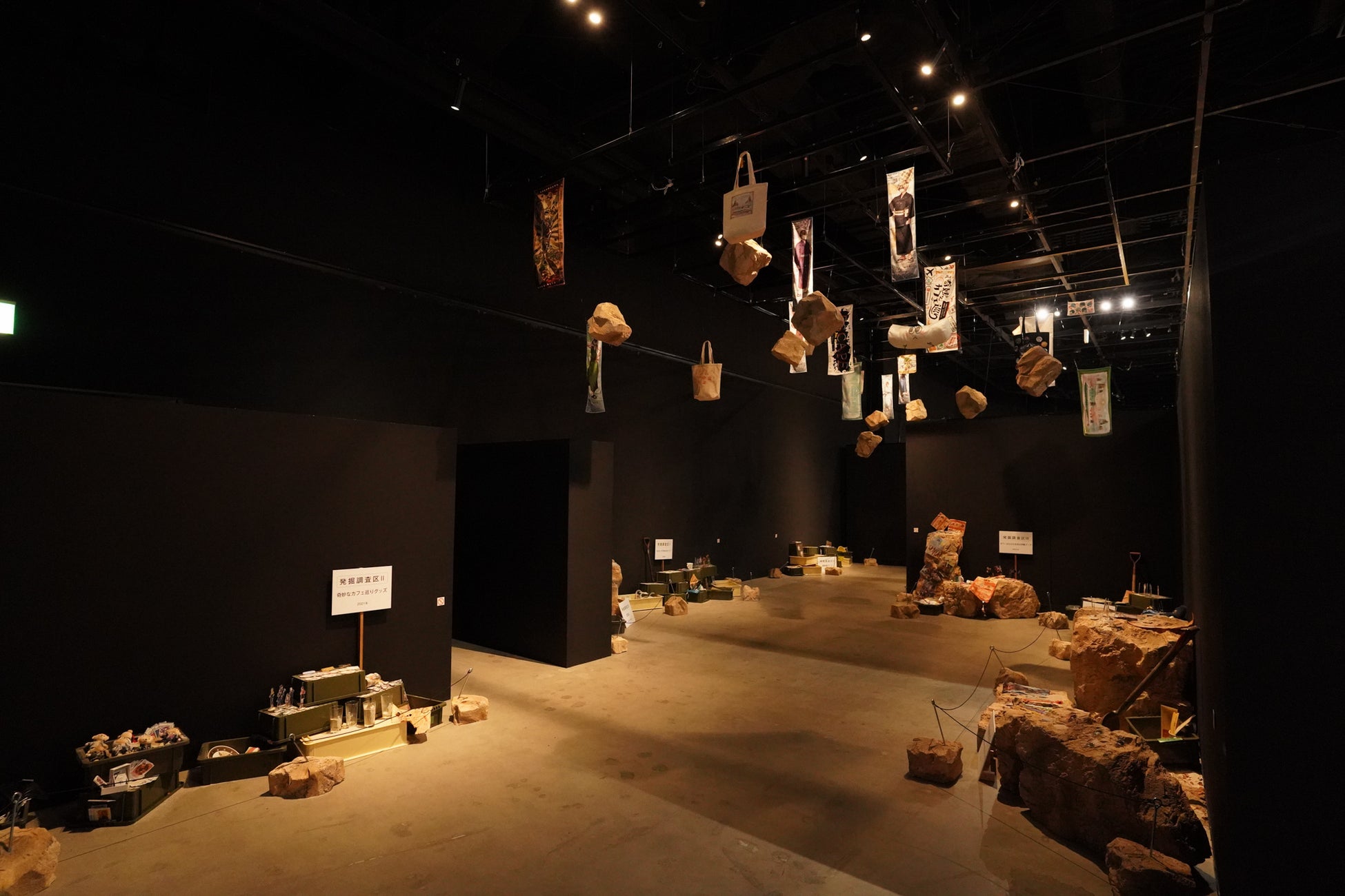 「第三展示室はグッズの発掘現場。いつの日か、YouTuberのグッズが出土する未来もあるかもしれないな……という空想を形にしました。もしそうなったら、グッズリストを参考に出土したものを分類するはず。そこになかったものは、謎の遺物になるんじゃないかと思うんです。なので、この展示でもグッズの試作品や追加販売されたグッズが〝リスト外〟の箱に収められています。中にはかなりレアなアイテムやここで初公開になるアイテムもあるので、目を凝らして探してくださいね」
