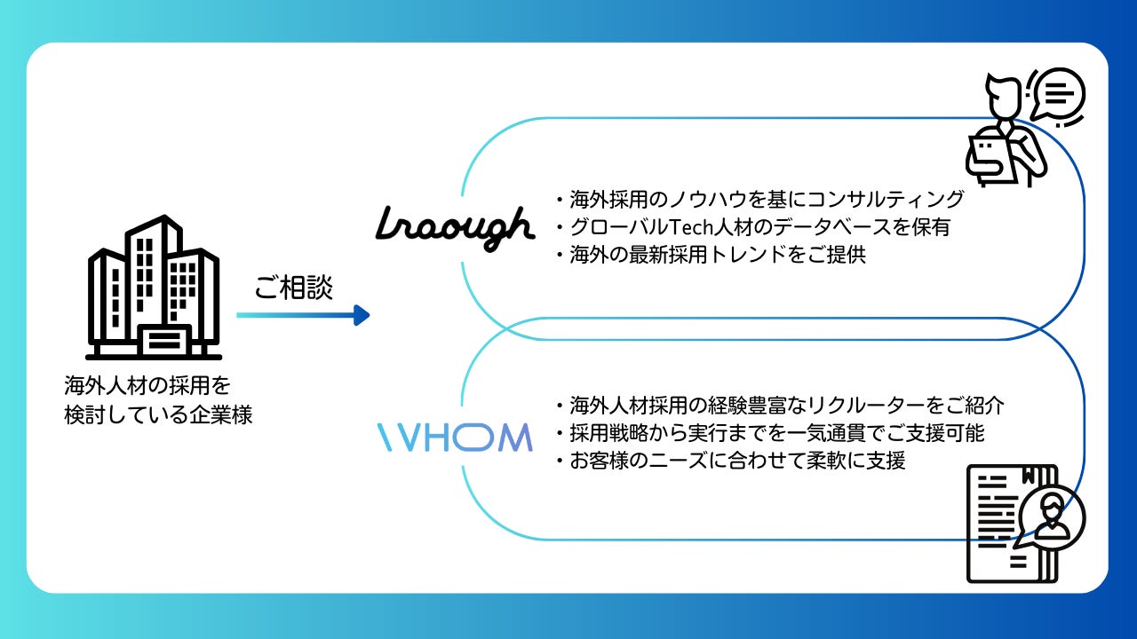 Lraough(ラフ)は優秀な人材が多く集まる北米⻄海岸での採用コンサルティングに強みを持ち、数多くの米国現地企業で働くプロダクトサイドのTech人材をデータベースに保有しています。一方で、WHOMは採用支援(RPO)のプロフェッショナルとして企業の採用戦略設計から遂行までを支援しており、日本貿易振興機構(ジェトロ)による「高度外国人材スペシャリスト業務」の業務委託先としても採択(*1)されています。