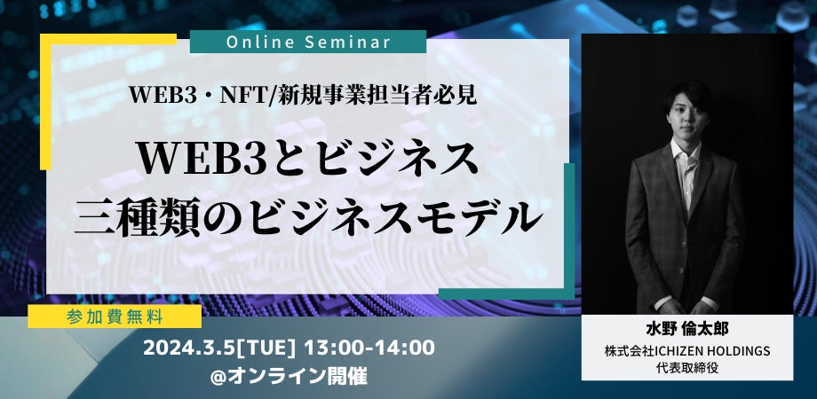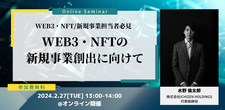 株式会社ICHIZEN HOLDINGS(東京都渋谷区、代表:水野倫太郎)は、2月6日より毎週火曜日【地方創生xWEB3/NFTの取組事例】【地方創生xWEB3/NFTの相性と意義】【WEB3/NFTの三種類のビジネスモデル】【WEB3/NFT新規事業創出】これら4つのテーマで無料ウェビナーを開催します。