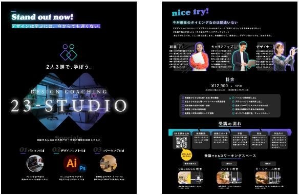 デザインスクールの23-STUDIO様のチラシ制作となります。本チラシは設置型での配布を想定して作成しました。表面は印象的なアイコンとRGBカラーを印刷で採用。若年層をターゲットに置いたためネオン系のグラデーションという印刷には珍しい仕様を採用しました。下部には強みとなる3つのメリットをわかりやすく配置。表面の情報・デザインをフックに裏面へと誘導を促すデザインに仕上がっています。