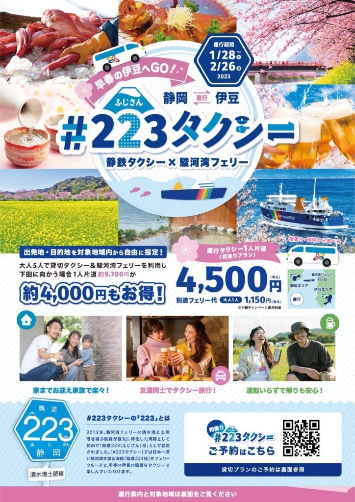 企画はとても魅力的ですが、そもそも需要創出事業であり、もともと静岡や伊豆に興味のあるユーザーがタクシーを利用してこの時期に伊豆に旅行に行く文化は微塵もありません。まずは今回のツアー企画自体の認知の底上げが重要と考えました。チラシでは目を引くメインビジュアルで静岡ならではの#223タクシーという命名をしました。料金のお得さや、それぞれのユーザー層を明記しメリットを記載することで参加しやすい雰囲気を醸成しました。裏面にはスケジュールや図をいれつつ、イベント情報を掲載することでより行きたくなるよう工夫しました。