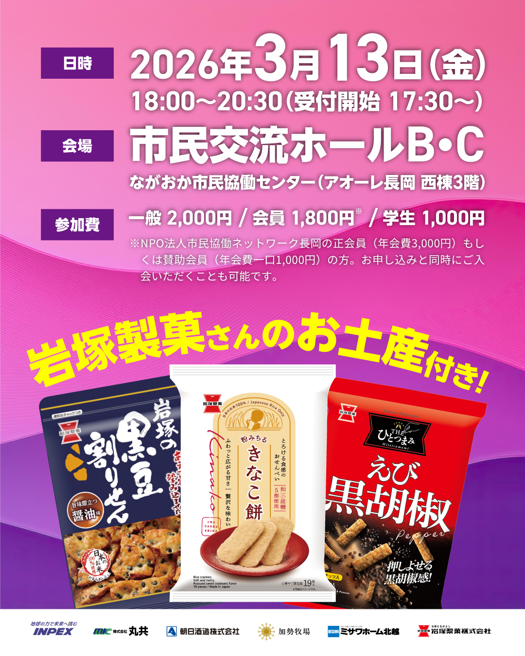 ※会員はNPO法人市民協働ネットワーク長岡の正会員・賛助会員です。当日入会も可能です。いただいた参加費は、市民活動団体の活動支援のために使わせていただきます。