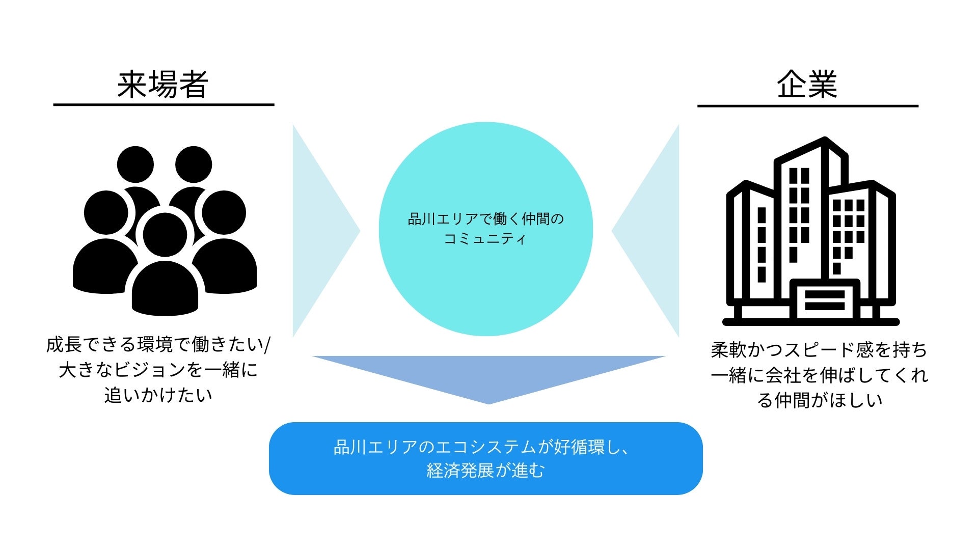 品川エリアに位置する魅力的かつ成長中の企業とU30の成長意欲旺盛な若者をマッチングさせることで人材不足解消、事業成長を後押し、品川エリアのビジネスエコシステムに寄与します。