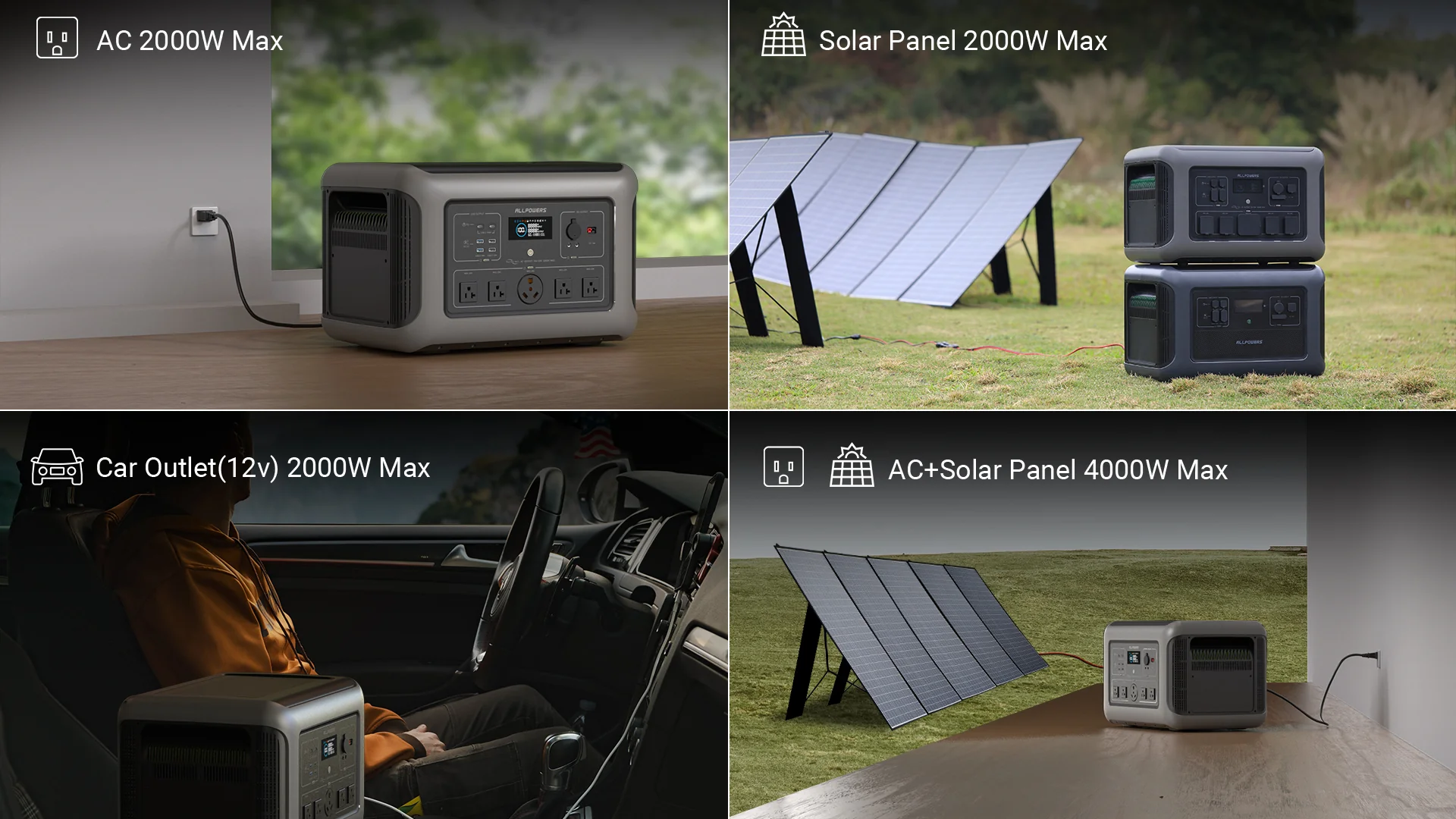 ・4つの充電方法:AC入力/ソーラー入力/発電機から充電/車から充電/風力発電から充電