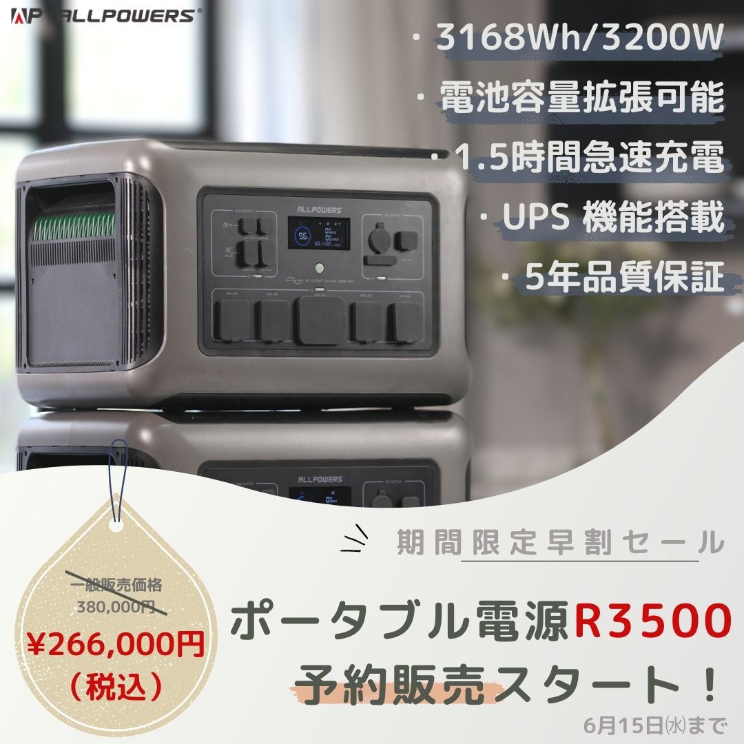 【ポータブル電源新発売】誰でも簡単に構築できる節電システム。ALLPOWERS超大容量・高出力・容量拡張可能のポータブル電源R3500が、5月20日より予約販売スタート!