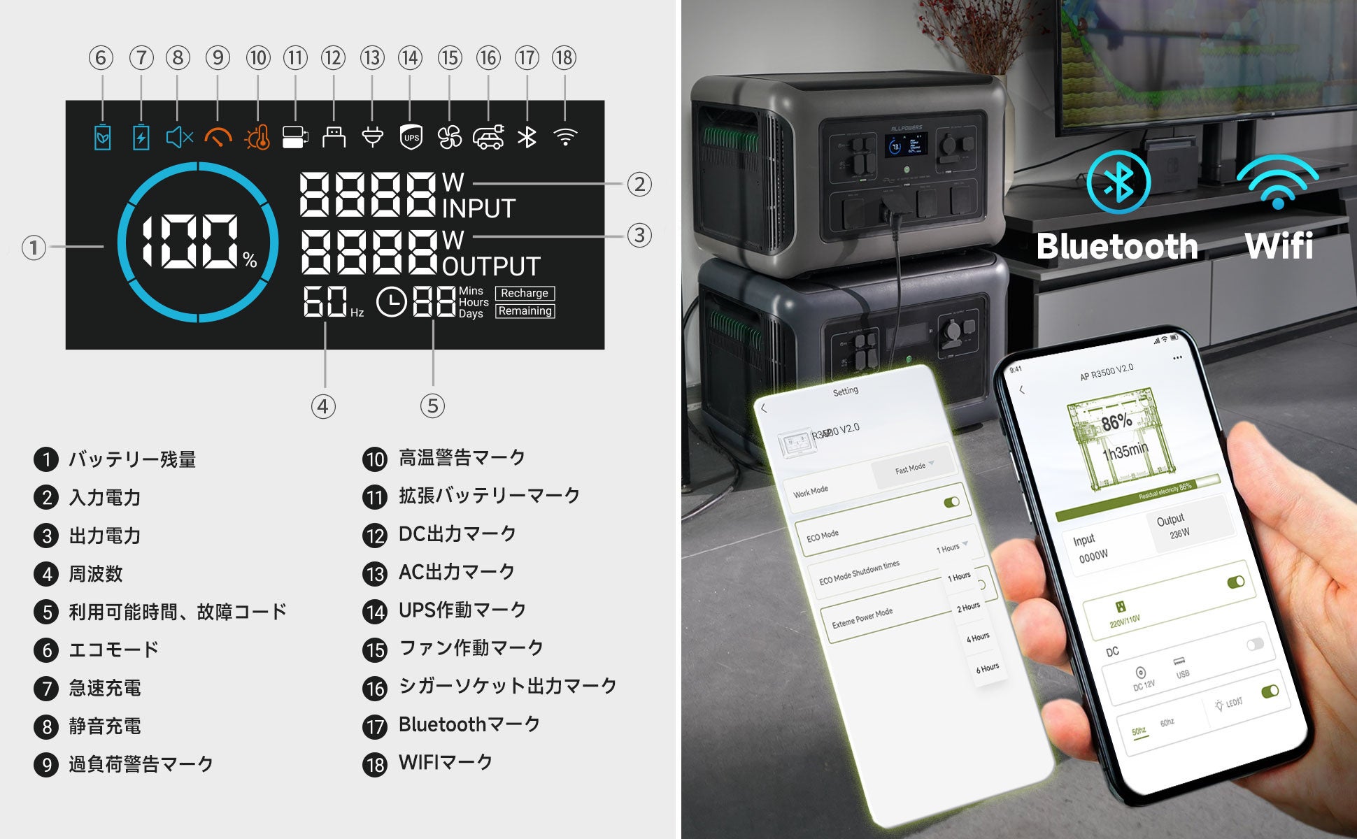 ALLPOWERS R3500 ポータブル蓄電池はボタン操作のほか、ALLPOWERS専用アプリから簡単にリモート操作できます。操作可能機能:①バッテリー残量、入力電力、出力電力及び目安の利用可能時間などの情報を確認、②AC・DC・USB出力のオン/オフ、③LEDライトをつけ/消す、④周波数切替、⑤充電モードの切替、⑥エコモードの時間設定など。